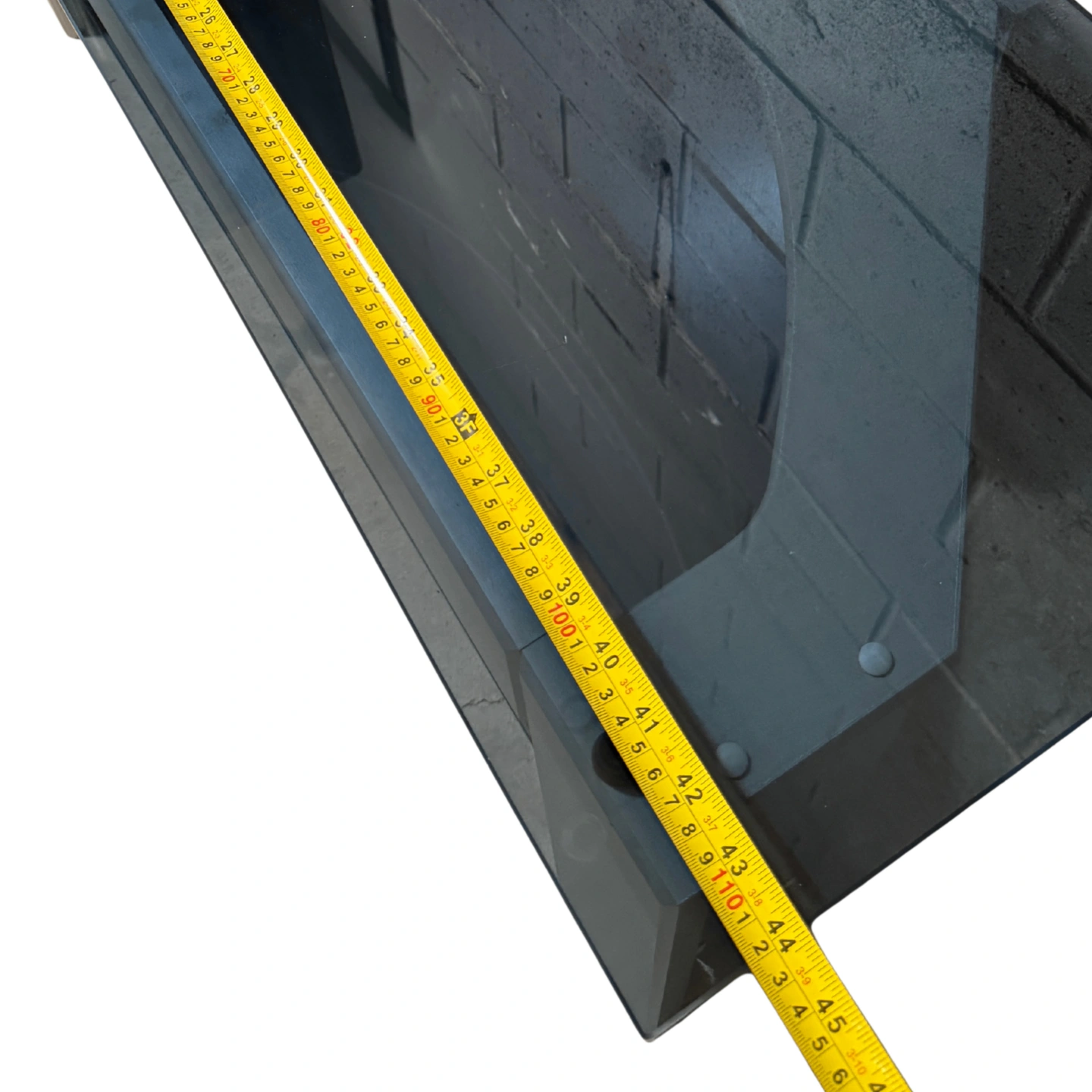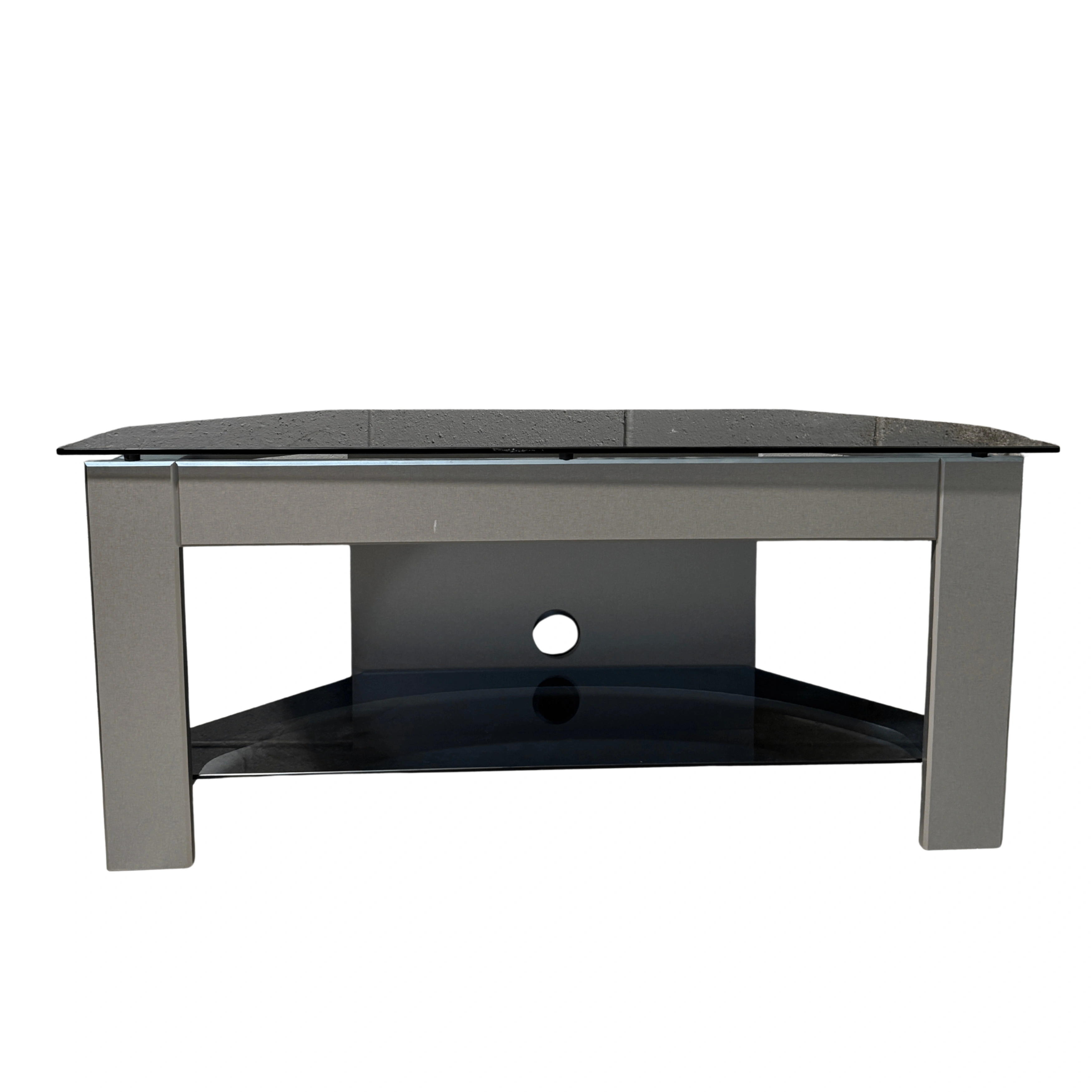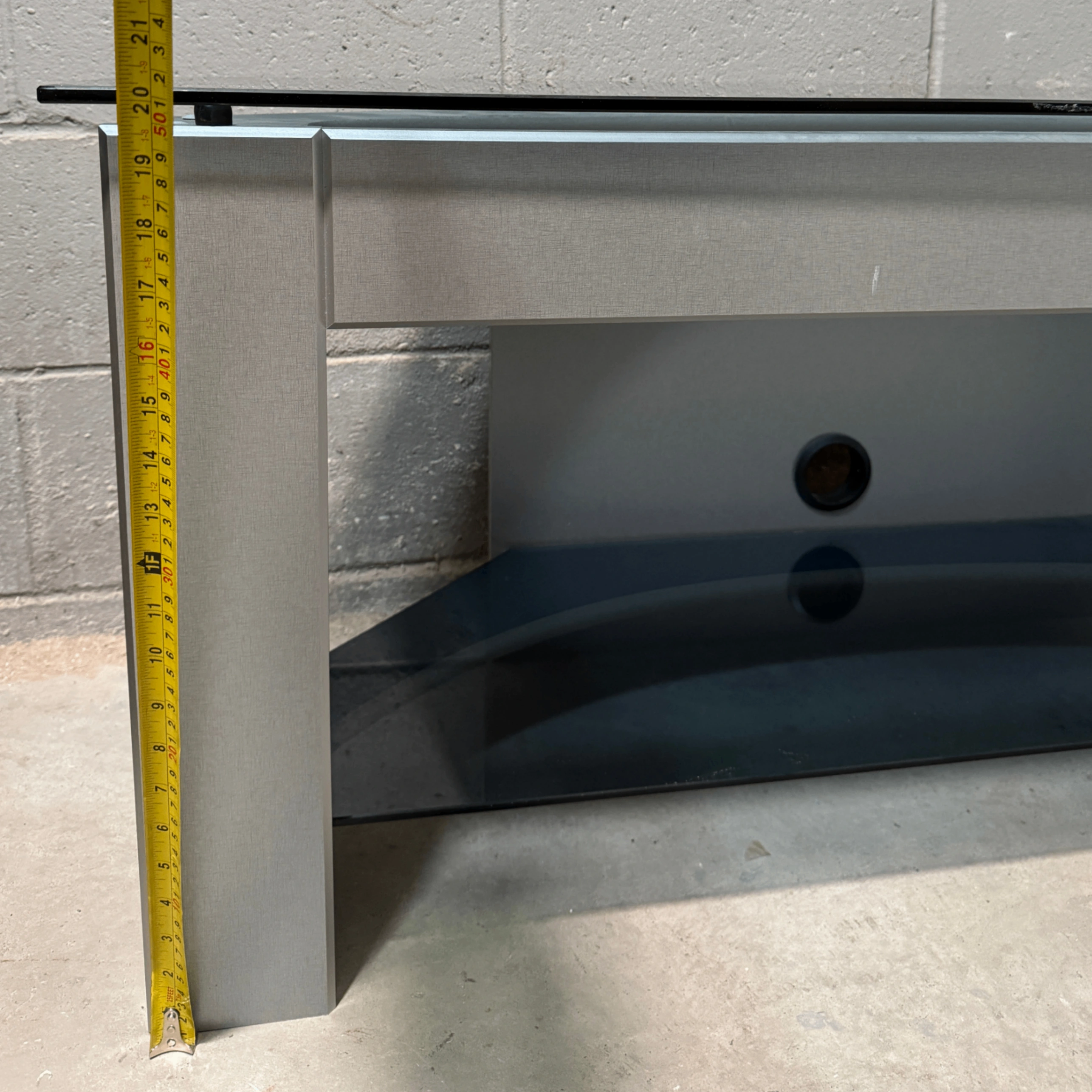Selling a glass and metal TV stand. It has a sleek and modern design. The stand measures approximately 45 inches in length, 16 inches in width, and 21 inches in height. It is in good condition and ready for a new home!