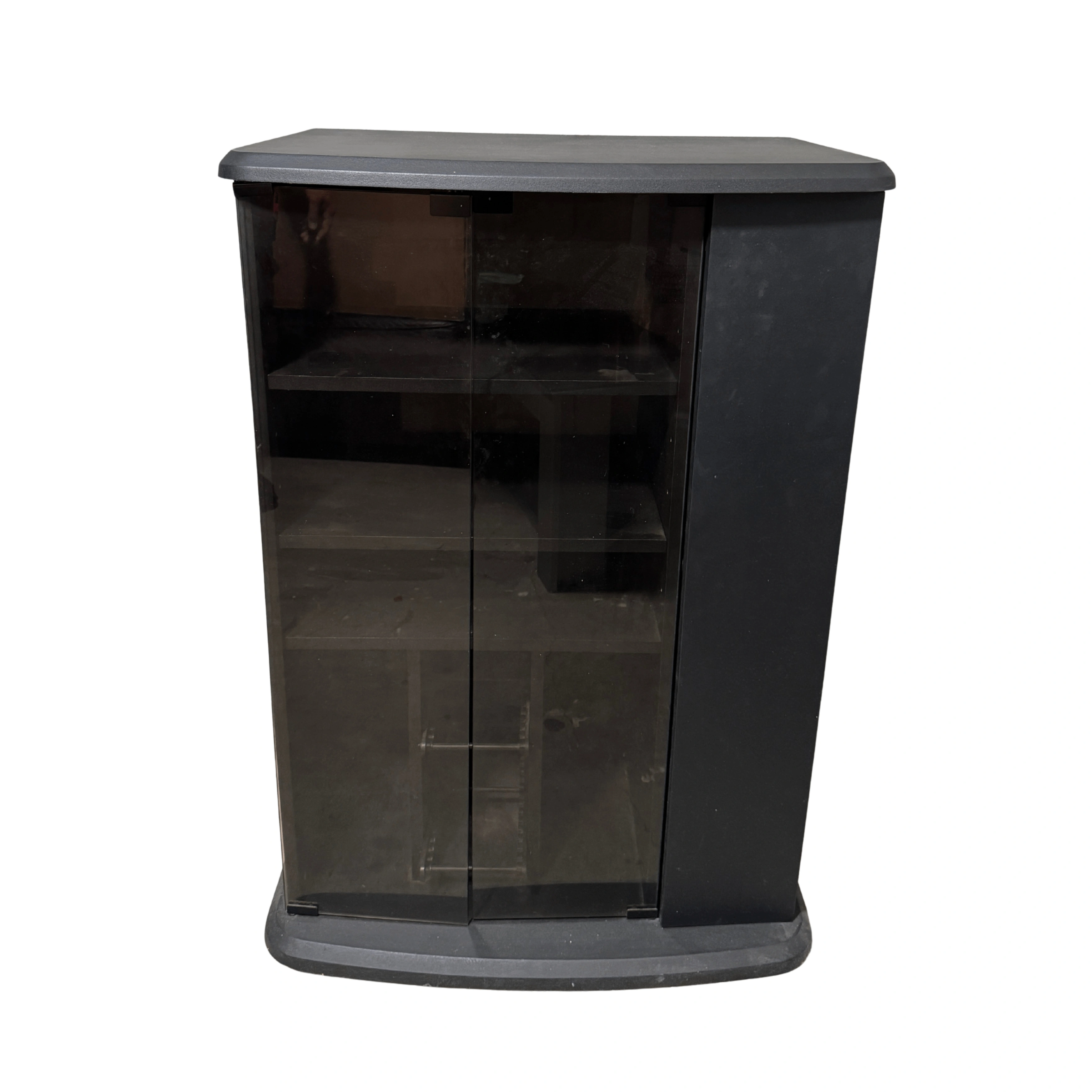 Selling a black corner media cabinet with glass doors. It has a few shelves inside, perfect for storage or display. Dimensions are approximately 18 inches wide, 26 inches deep and 40 inches tall. It's in good condition and ready for a new home!