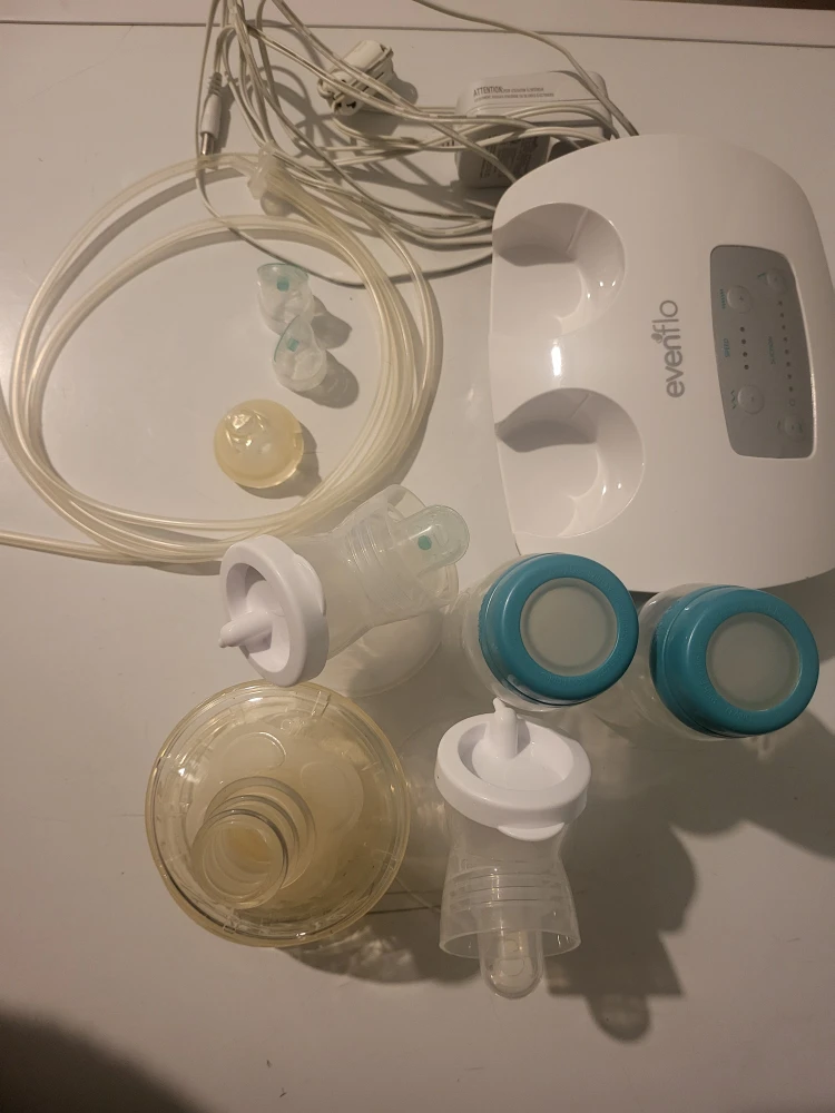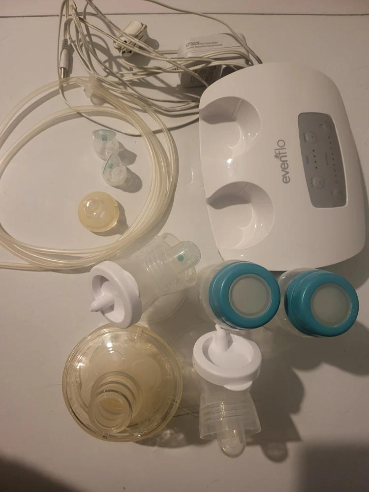 Selling an Evenflo double electric breast pump. It comes with all the parts you see in the picture, including the bottles, flanges, connectors, and tubing. It's in great condition and ready to use! I only used it for once. Pick up only. And is not in the box.