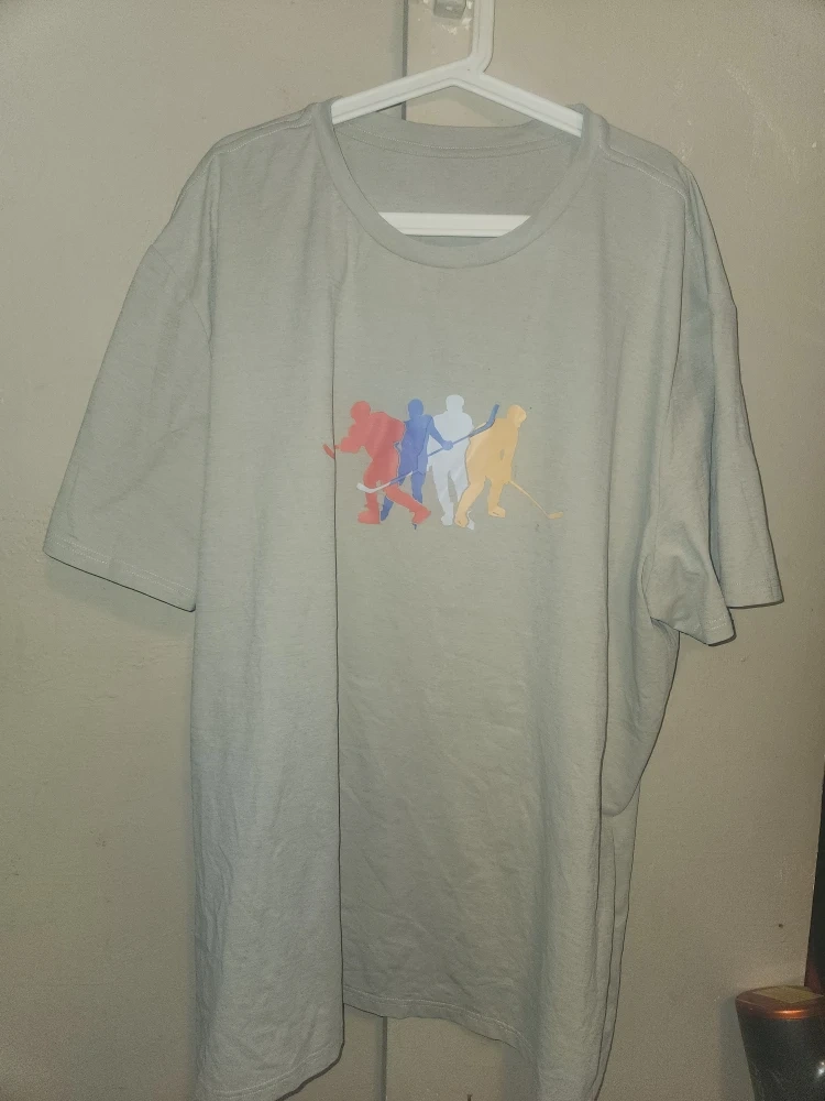 Gifting a comfy t-shirt with a cool hockey graphic! The design features players in red, blue, white, and yellow. It's a great casual piece for any hockey fan. Free. Pick up only.
