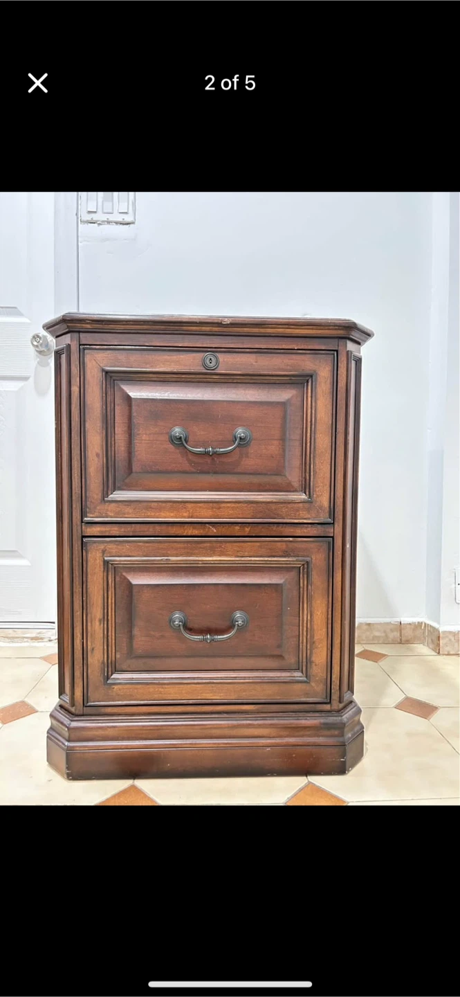 Here's a lovely wooden two-drawer filing cabinet! It's perfect for keeping your documents organized and adding a touch of classic style to your home office or workspace. It's in great condition and ready to use.