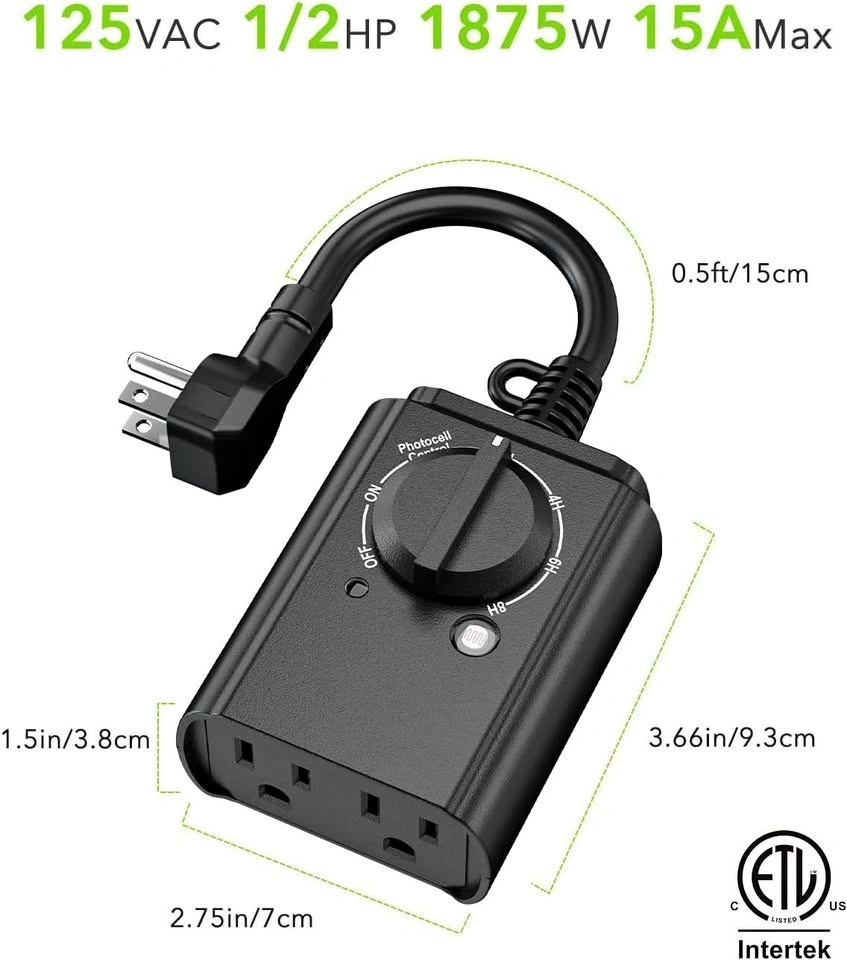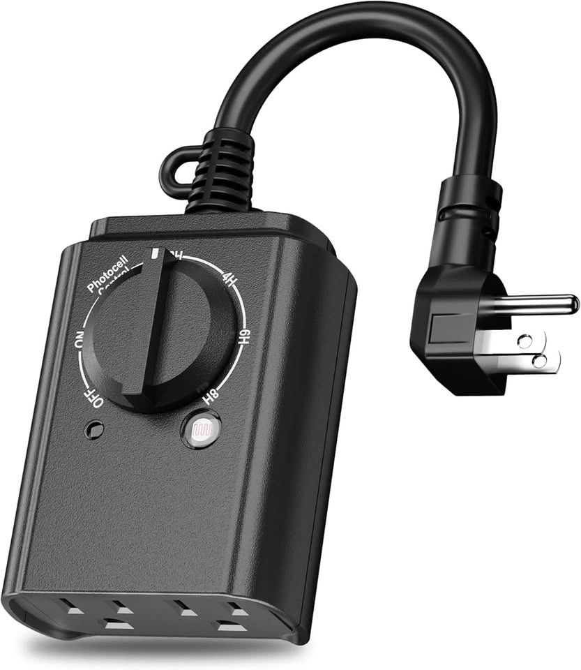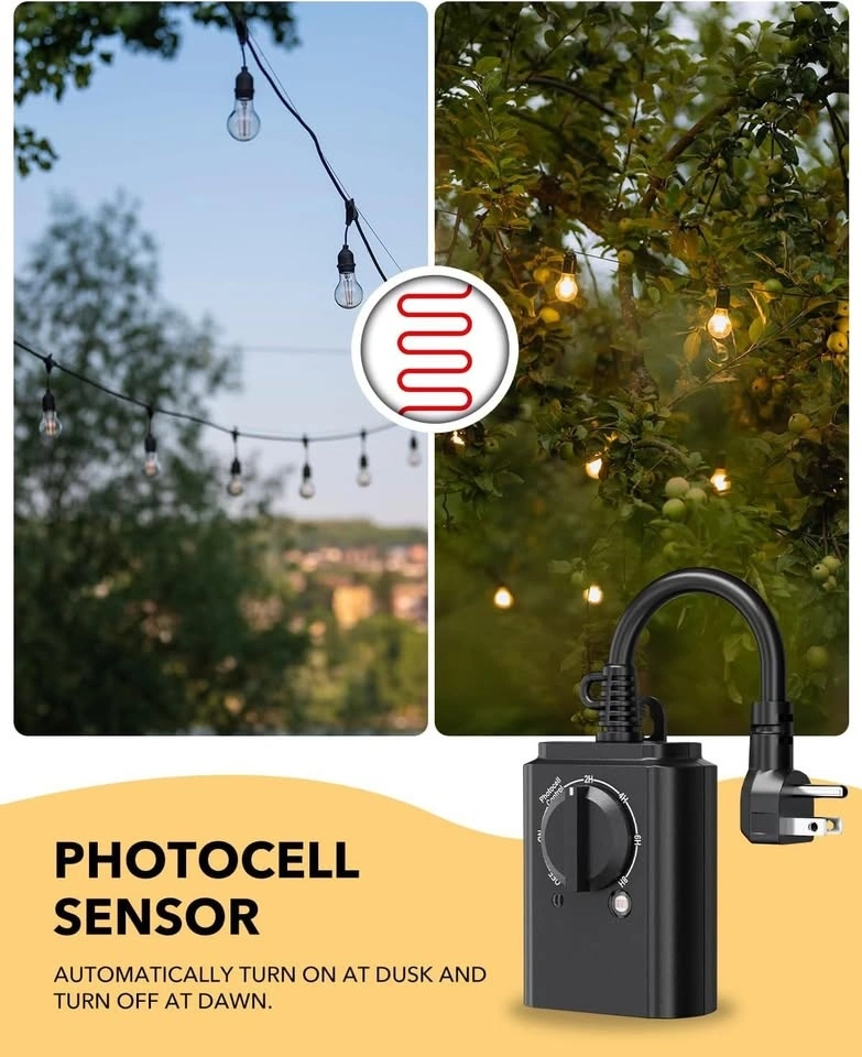 BN-LINK Outdoor 24-Hour Timer with Photocell Light Sensor, Water Resistant Photoelectric Countdown Timer(2, 4, 6 or 8 Hours Mode), Weatherproof, Two (2) Grounded Outlets for Home and Garden, Black