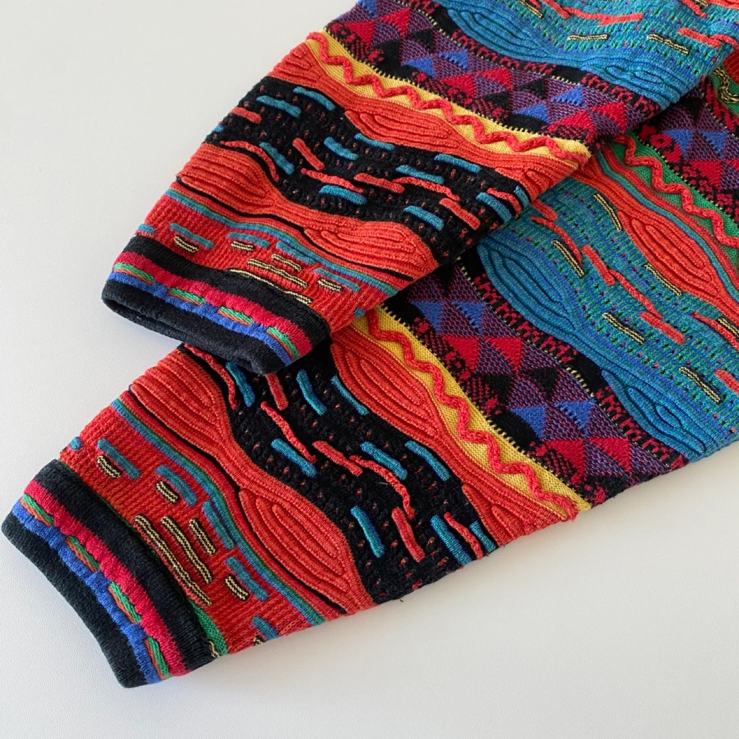 Vintage Coogi style multi-coloured 3D knit sweater. Made of 100% cotton. The vibrancy of the colour has faded slightly but there’s no staining, pilling or damage. It's clean and in excellent vintage condition.