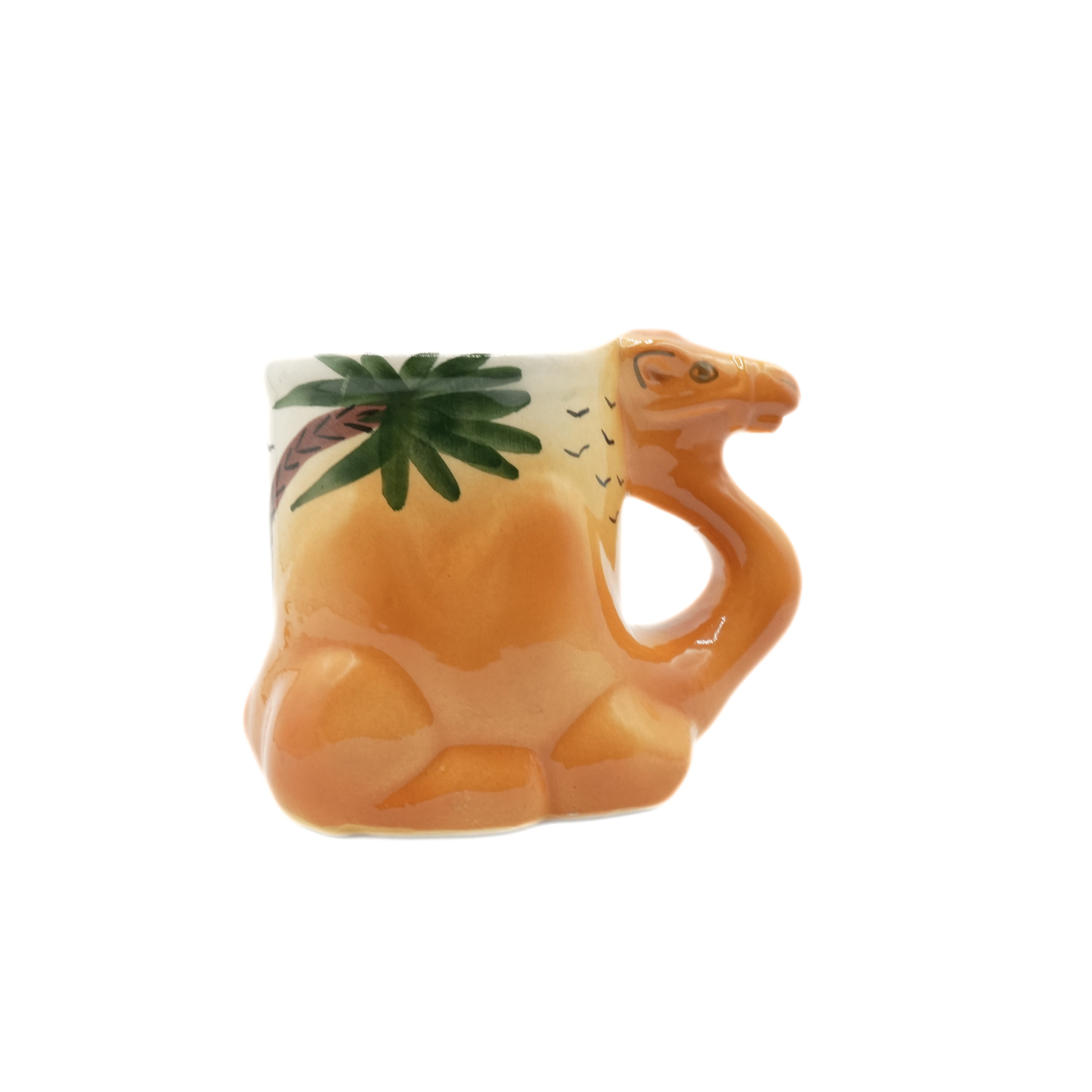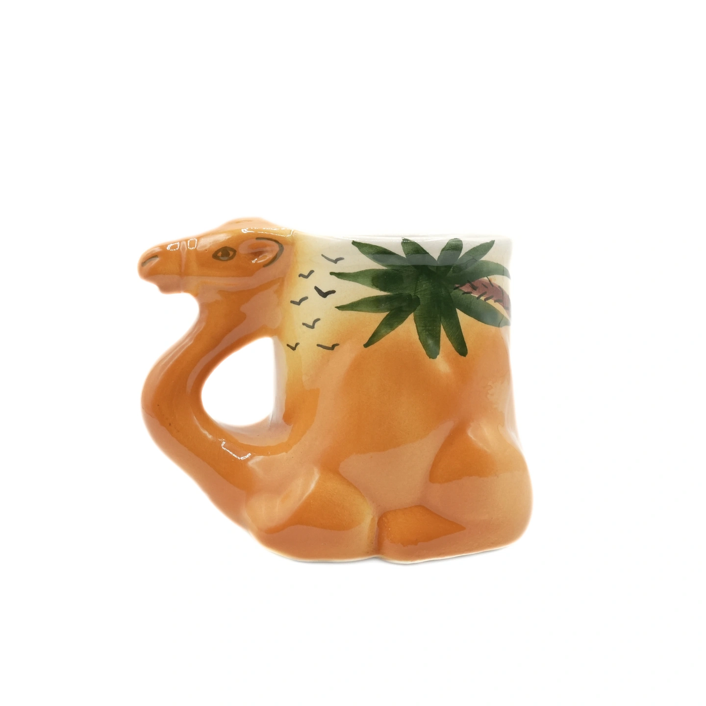 Here's a cute camel-shaped ceramic mug! It has a palm tree design on one side and a pattern of birds on the other. Perfect for adding a bit of whimsy to your morning coffee or tea