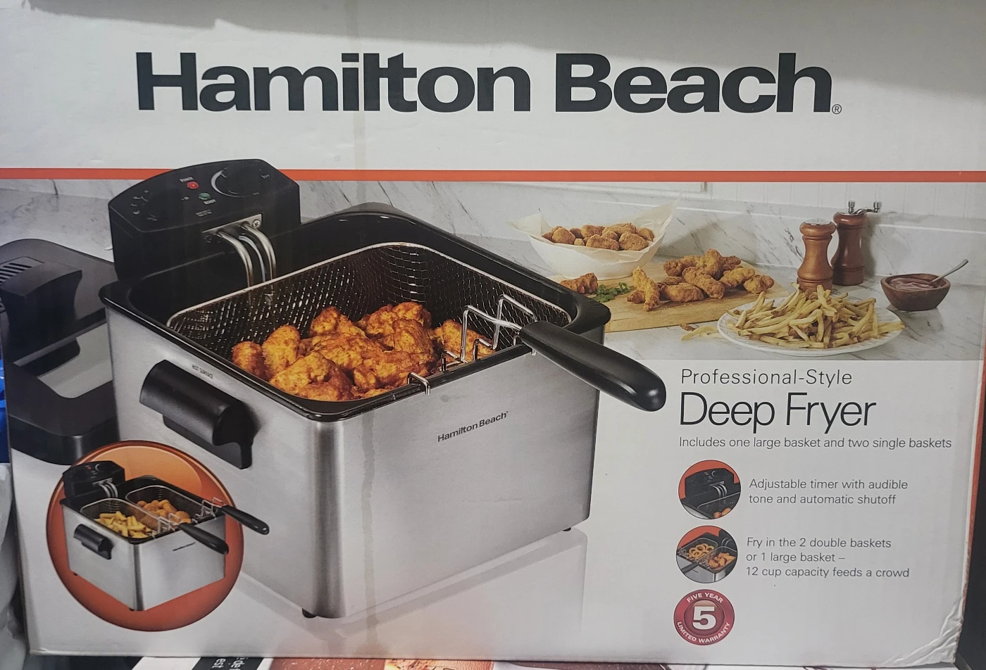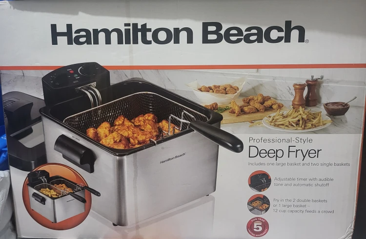 I'm selling a Hamilton Beach Professional-Style Deep Fryer! It includes one large basket and two single baskets. It also has an adjustable timer with audible tone and automatic shutoff. You can fry in the 2 double baskets or 1 large basket. The 12 cup capacity feeds a crowd! Used 2 times
