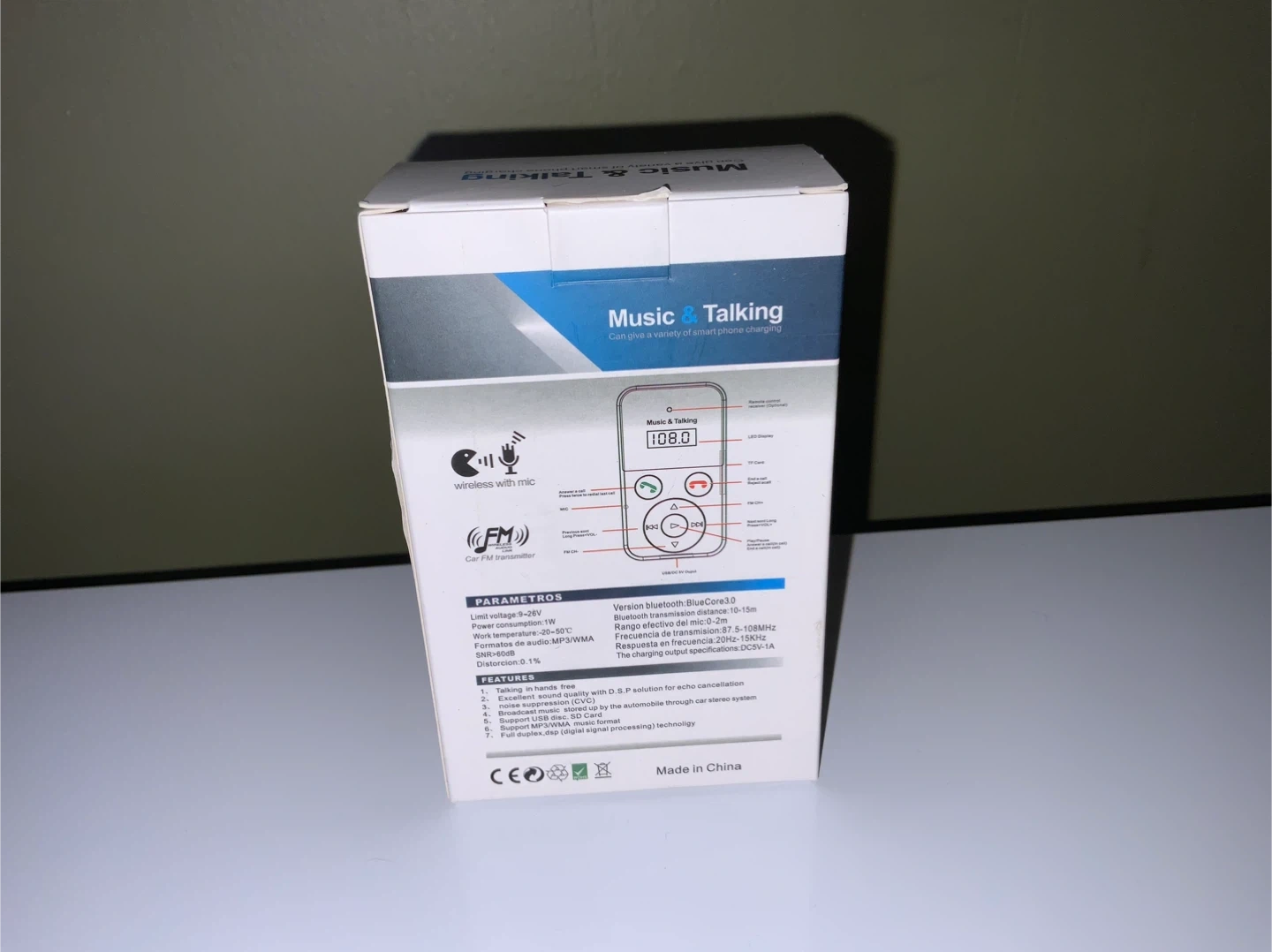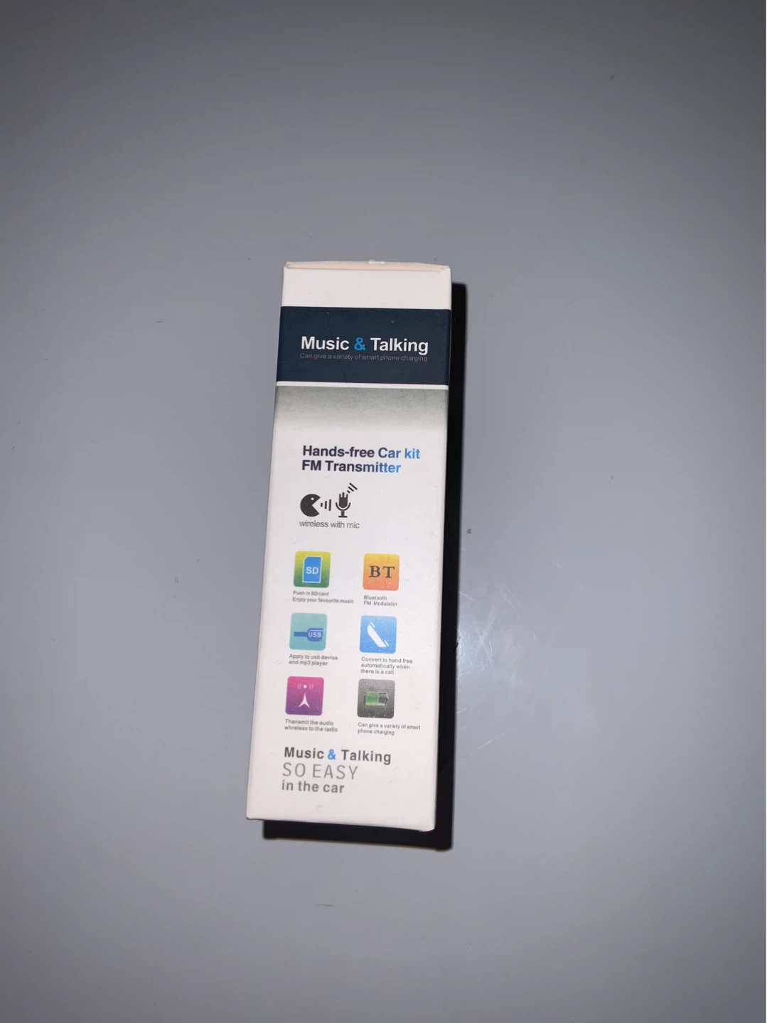 Brand new in box Hands-free FM transmitter car kit with USB Charging Port. It features a wireless mic. It can also play music off of a memory card. Perfect for hands-free calling and music streaming in your car!