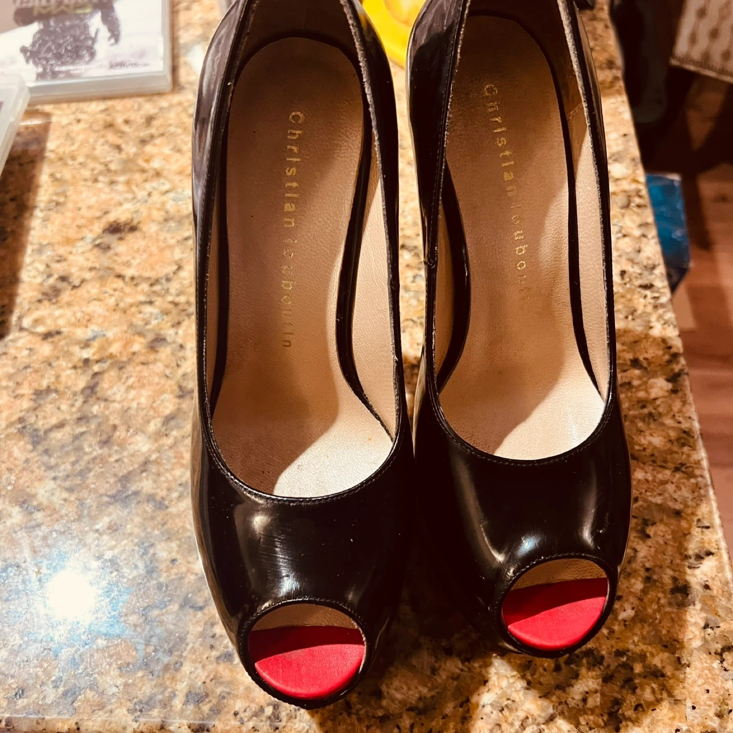 Selling a pair of Christian Louboutin heels. They are black with a red sole and open toe. They are in good condition!
