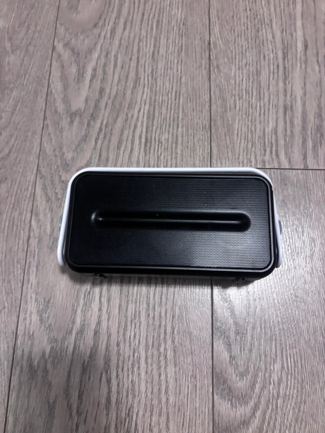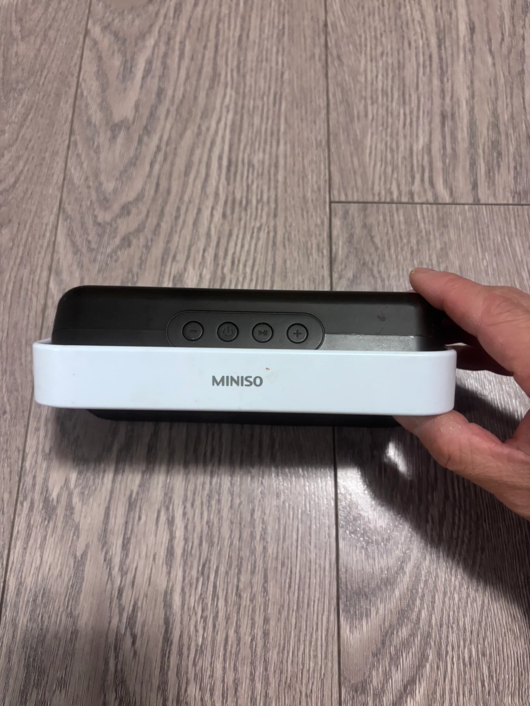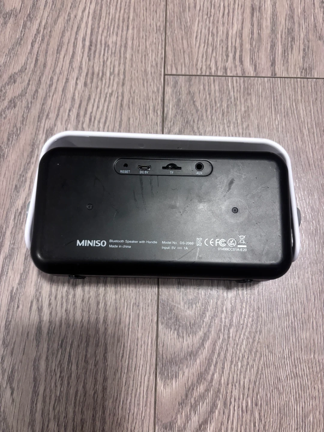 Selling a Miniso Bluetooth speaker with a handle! It's in great condition and ready to play your favourite tunes. The model number is DS-2060. It has a sleek black design with white accents. It also has ports for reset, DC 5V, TF, and AUX.