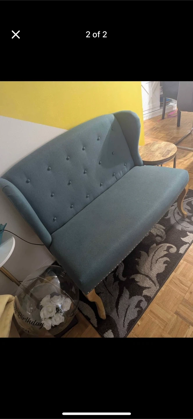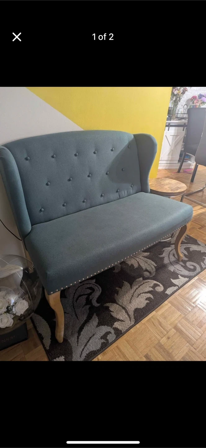 Selling a lovely loveseat settee. It's in great shape and would look perfect in any living space. It features a button-tufted back and elegant wooden legs. A charming addition to your home!