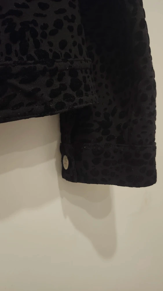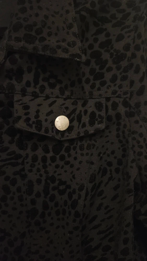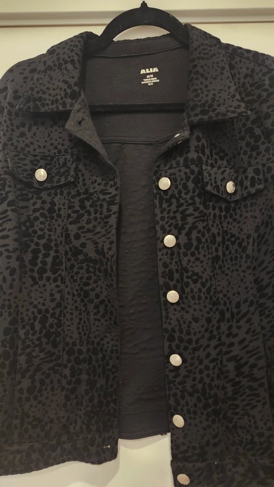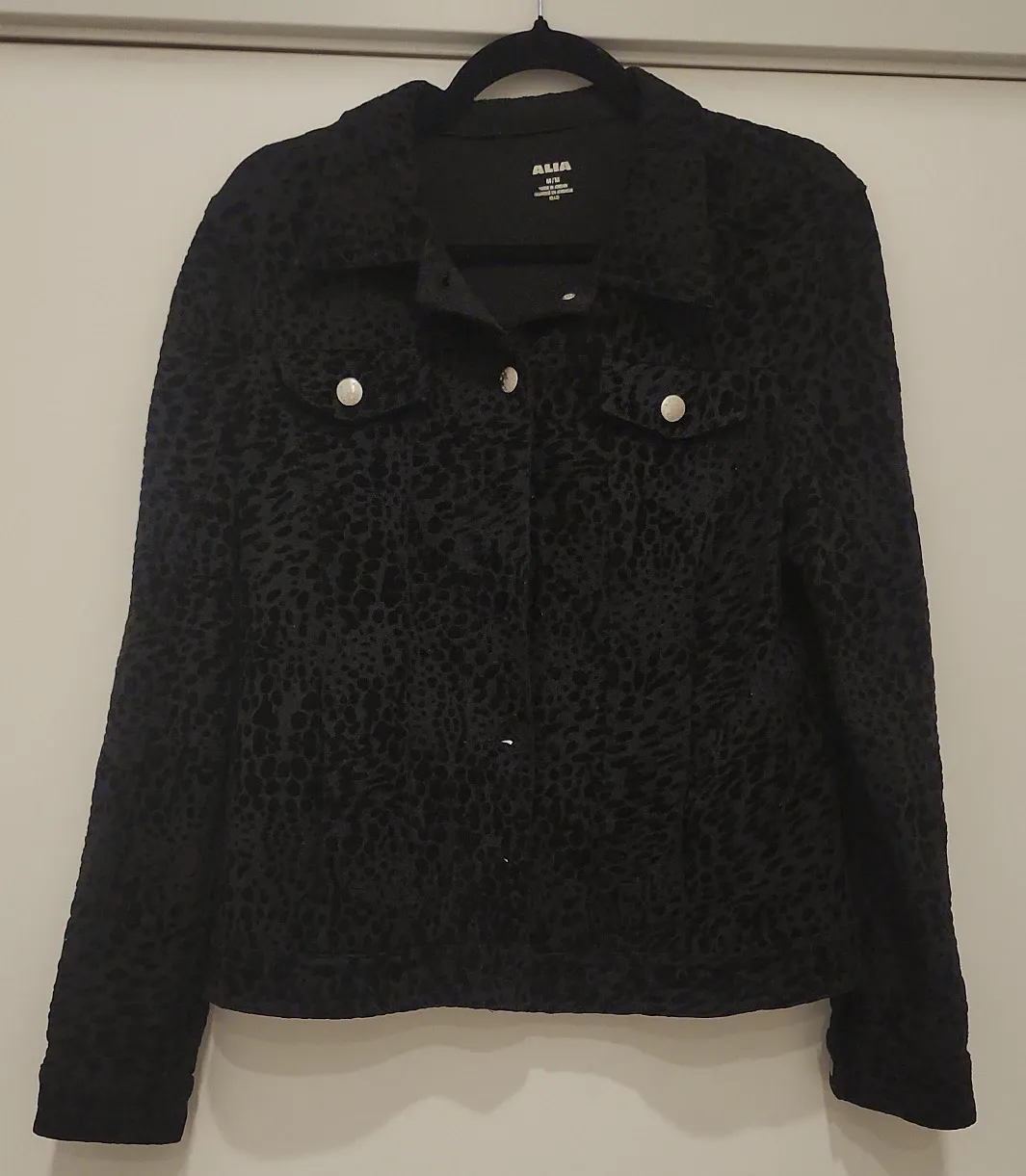 This is an ALIA black jacket with a cool leopard print pattern! It's a size M. The material is soft and comfortable, perfect for adding a bit of flair to any outfit