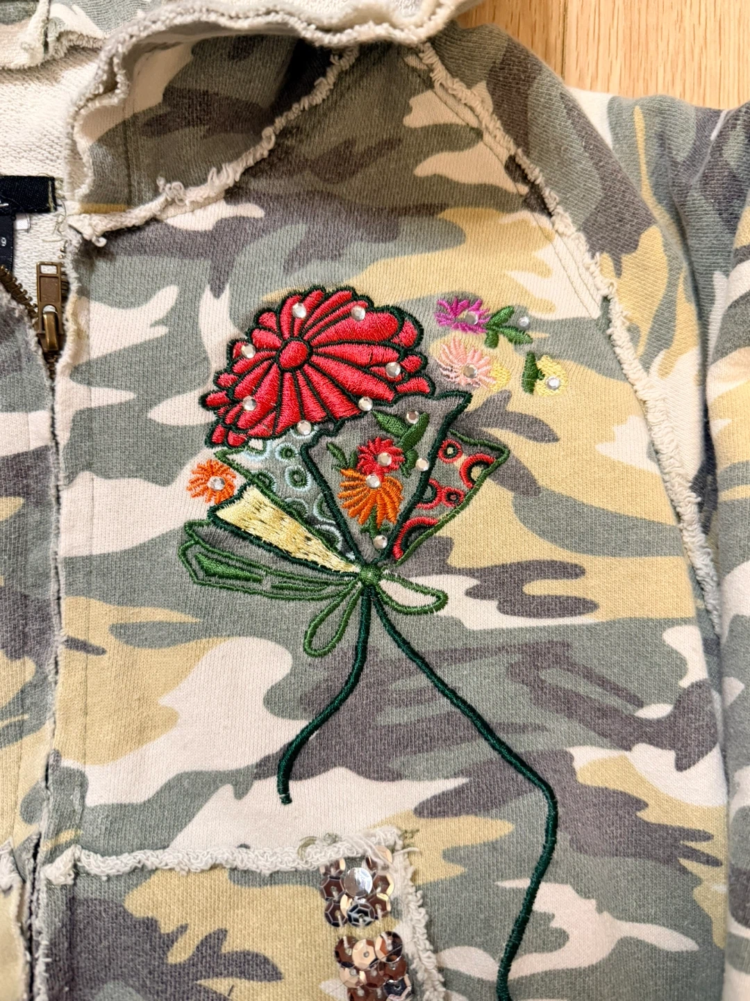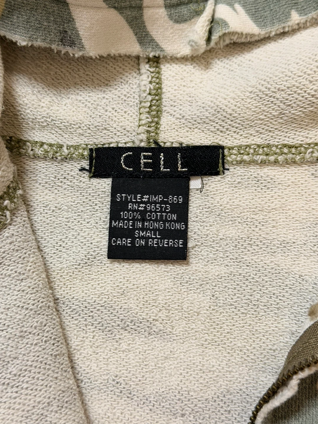 This is a cute CELL hoodie with a camo pattern and floral embroidery. It's a size small and made of 100% cotton. It's got a unique style with the floral design and sequin details!