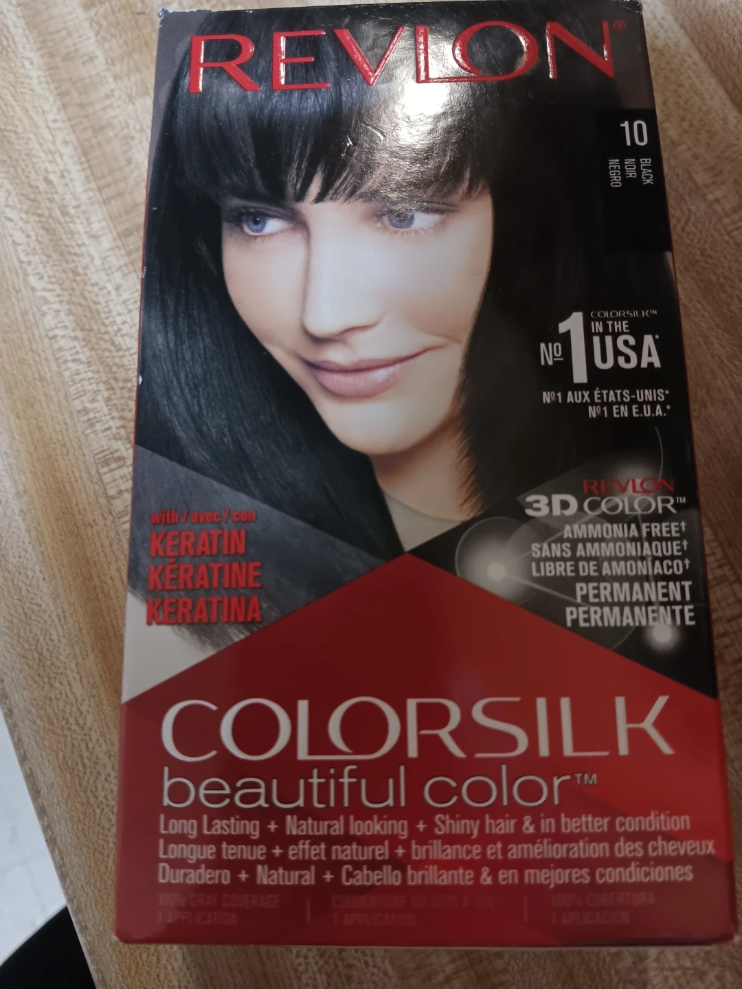 Selling a box of Revlon Colorsilk hair dye in shade 10 Black. This is a permanent hair color that provides 100% gray coverage in one application. It's formulated with keratin and is ammonia-free.