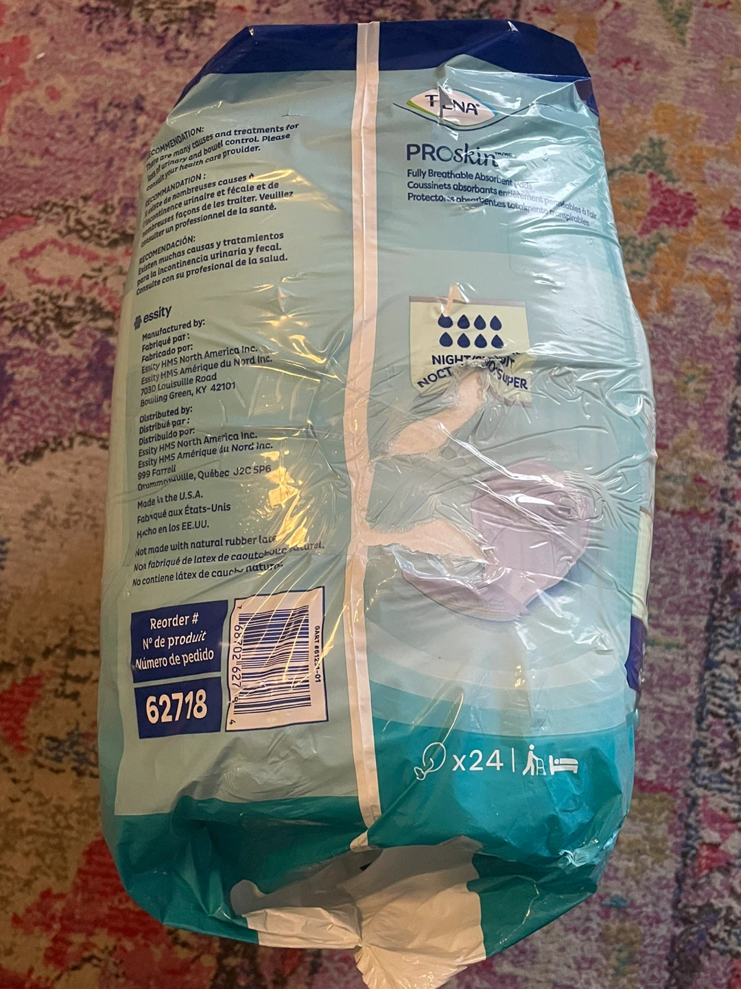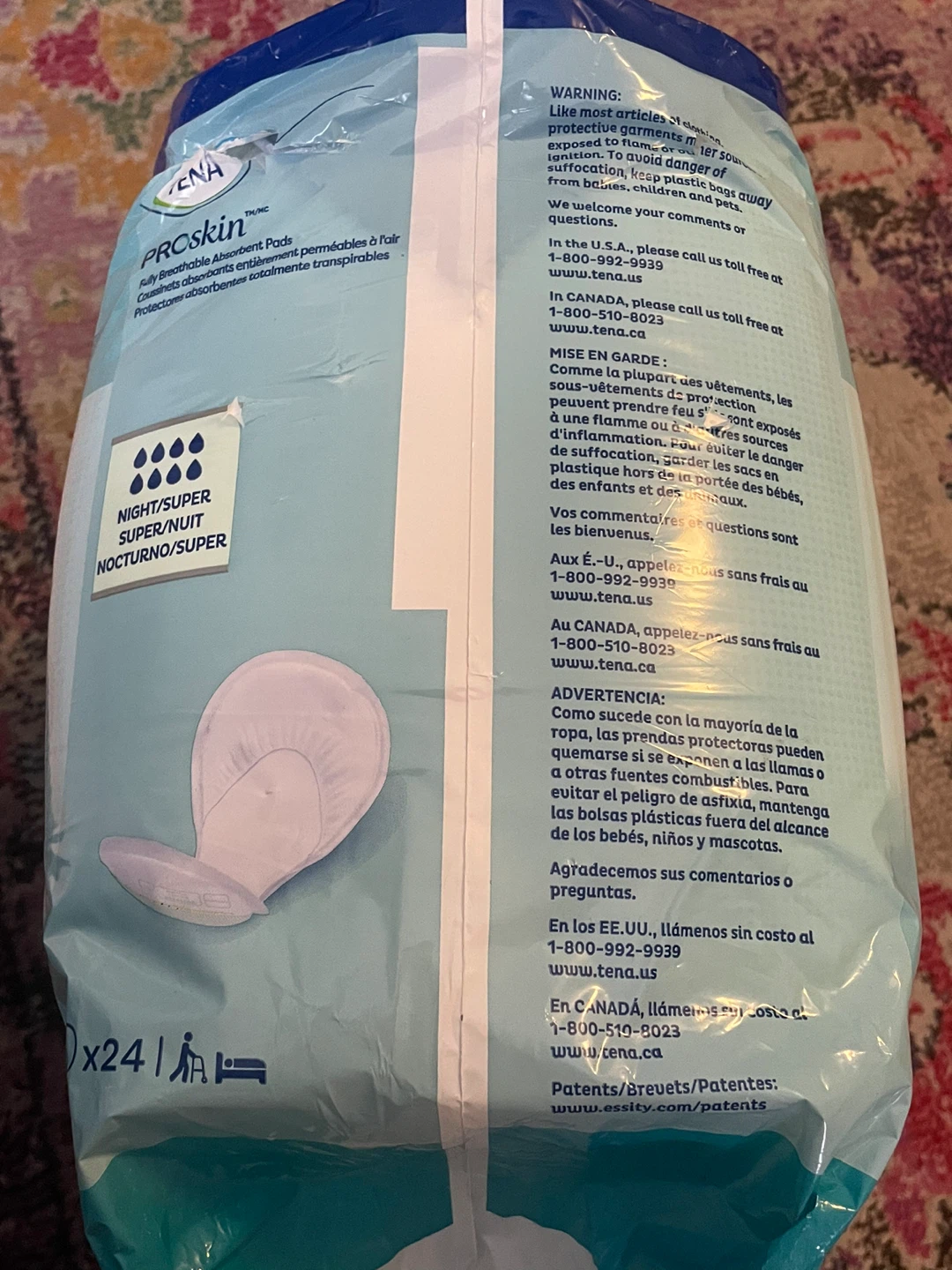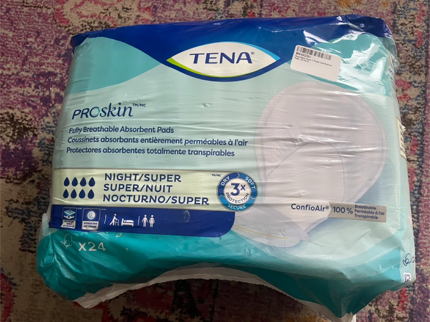 Selling a pack of TENA ProSkin Night/Super absorbent pads. This package contains 24 pads and offers 3x protection. They're fully breathable for comfort and dryness!