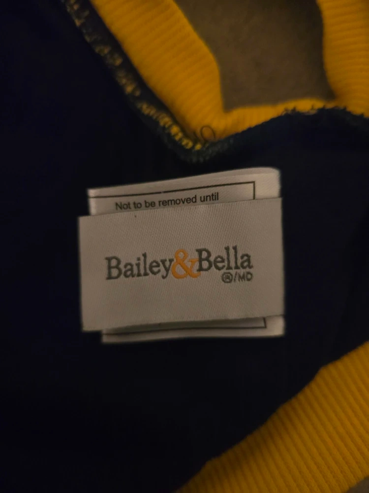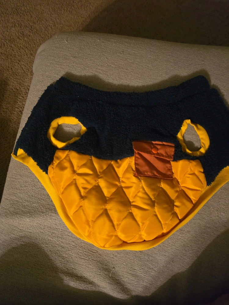 Selling a Bailey & Bella pet coat in size M/M. It's a stylish and cozy coat for your furry friend! The coat is made of polyester and cotton, perfect for keeping your pet warm. It features a navy blue and yellow colour scheme with a quilted design on the bottom half. Your pet will look adorable in this! For small dogs, has never been used, was way to small for my puppy.