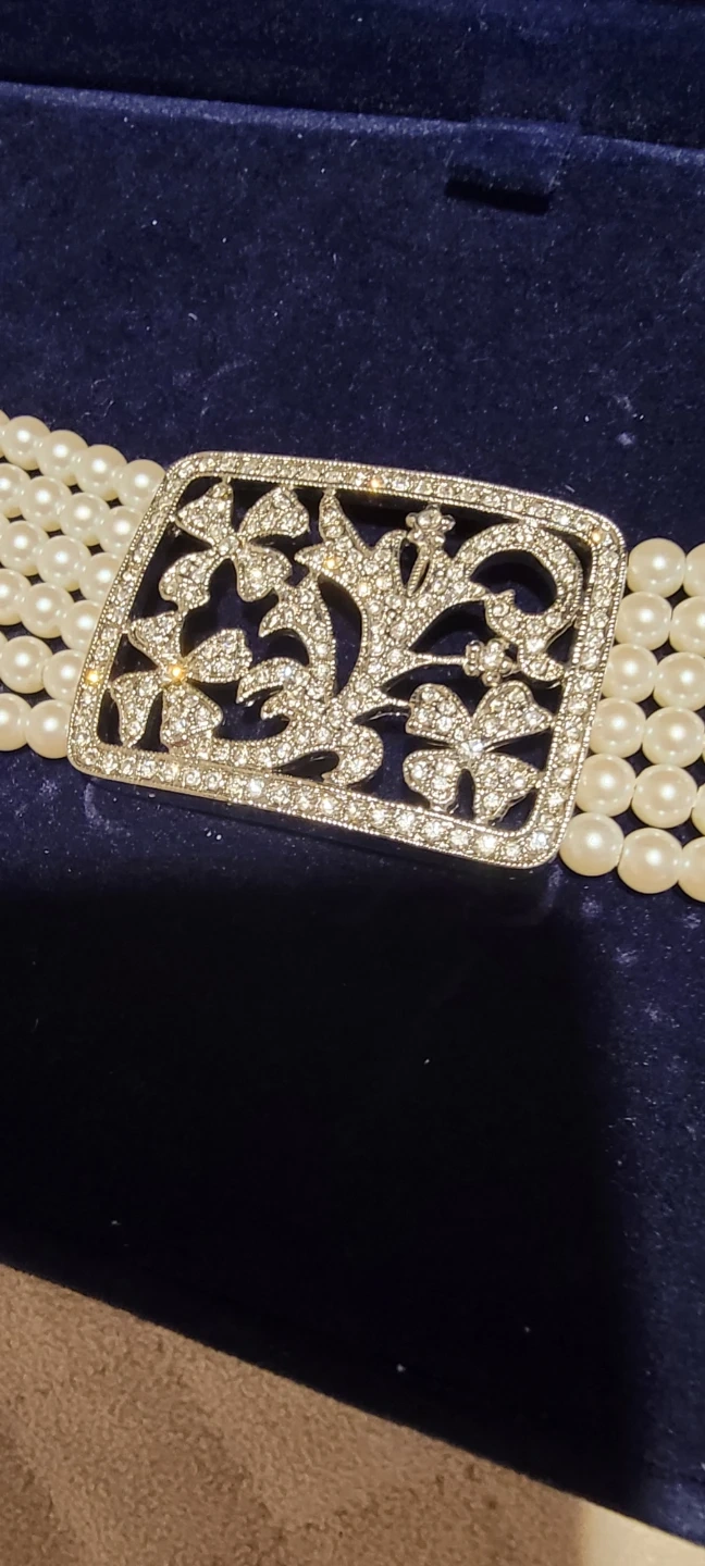 This is a beautiful pearl bracelet with a decorative clasp. It's in excellent condition and comes with its original box. The bracelet features multiple strands of pearls and an ornate, sparkling clasp that adds a touch of elegance to any outfit