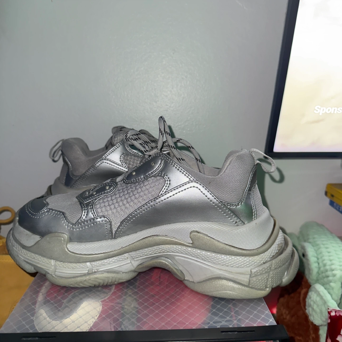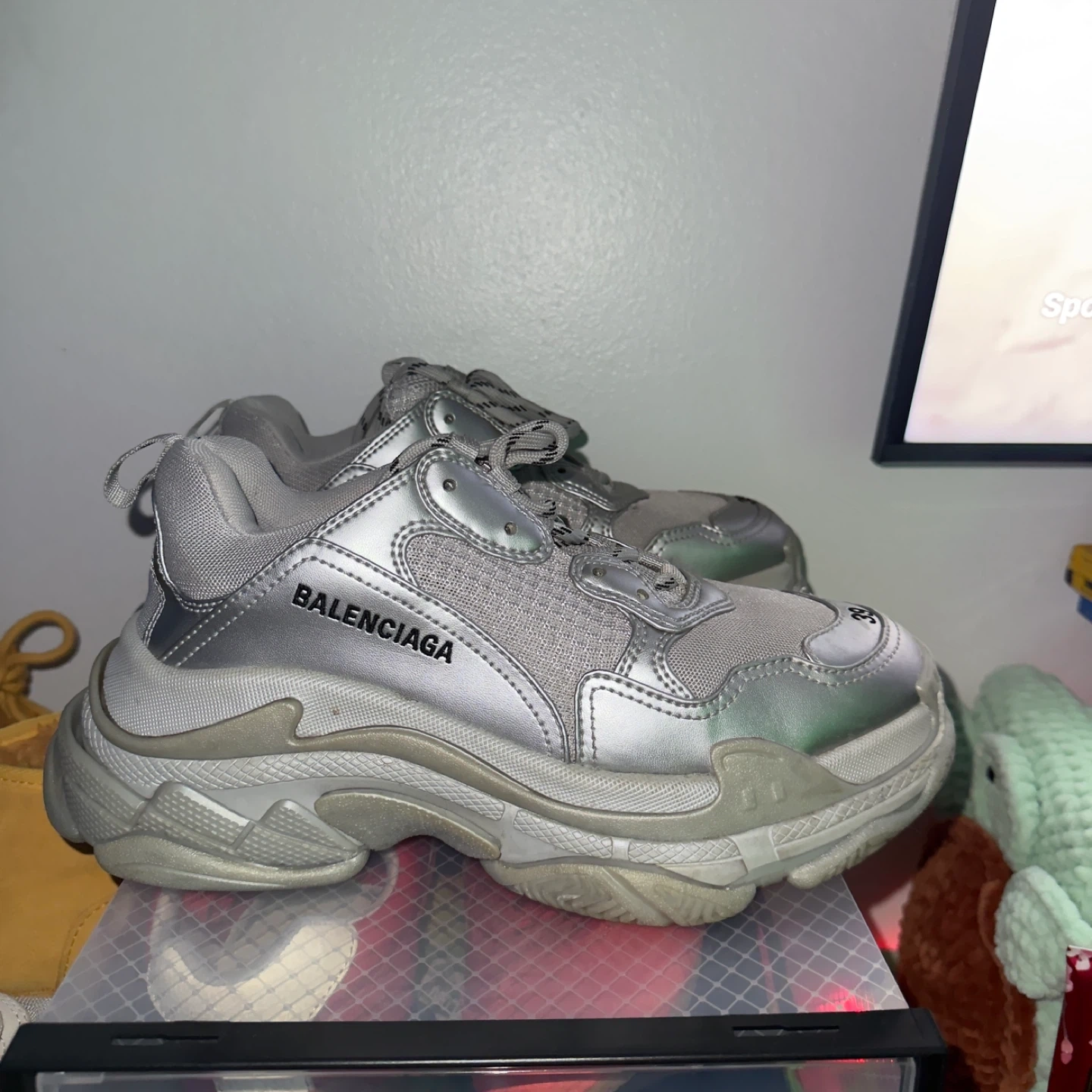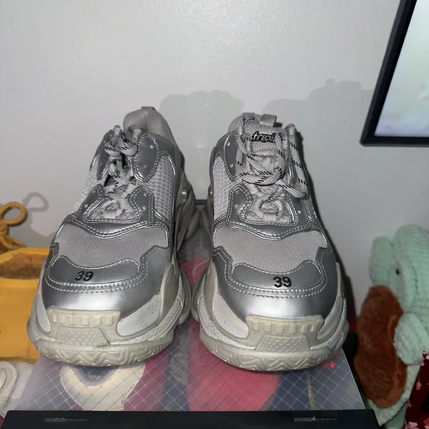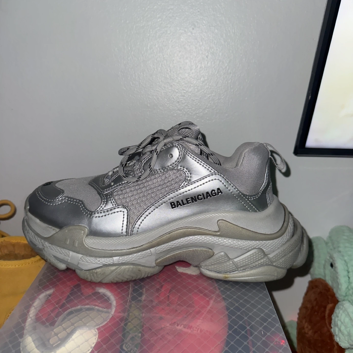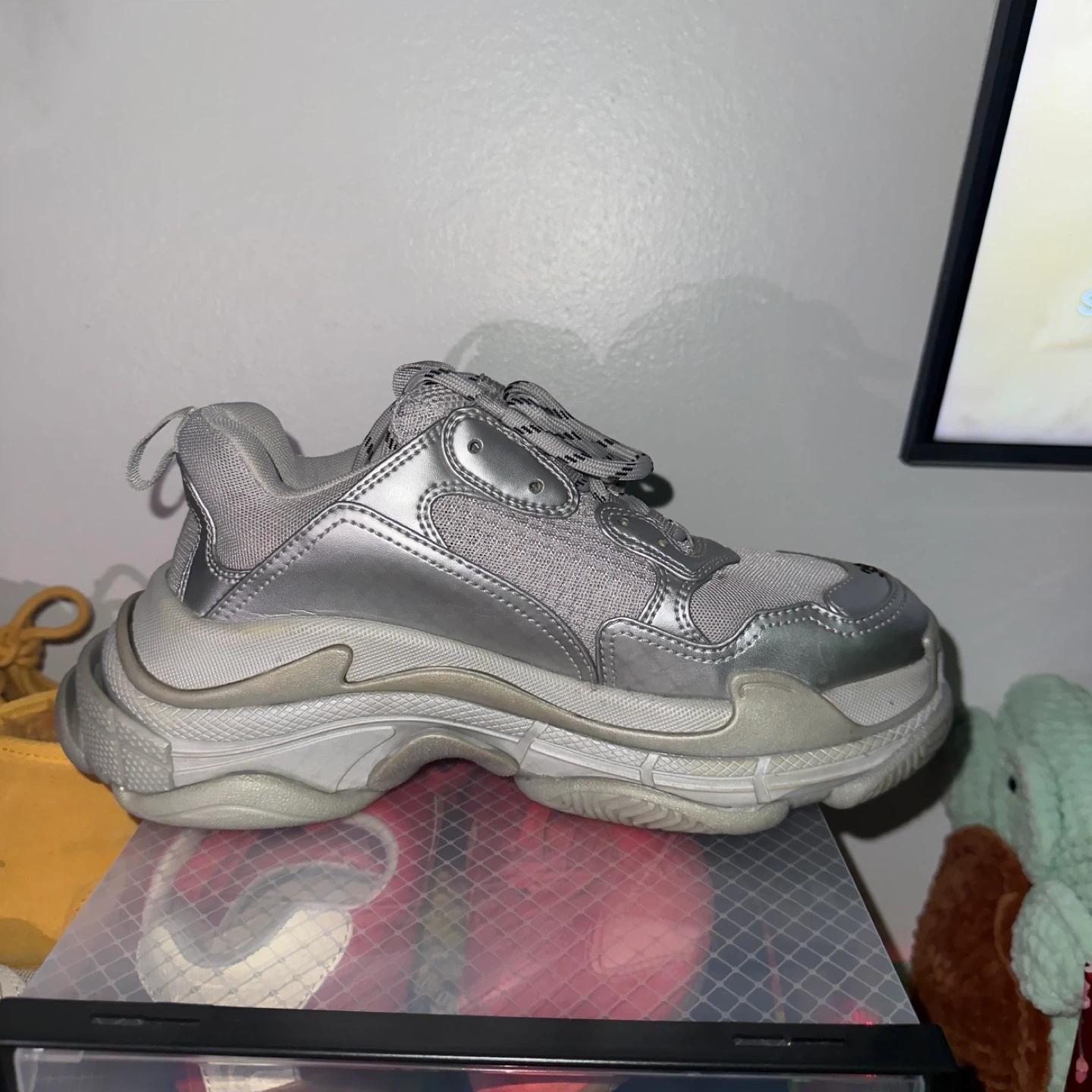 Selling a pair of Balenciaga Triple S sneakers in silver. They are a size 39. These are a stylish and iconic choice! Only worn once
