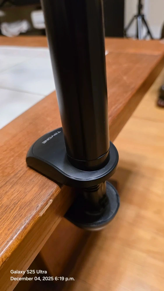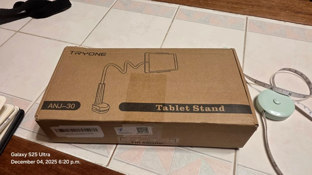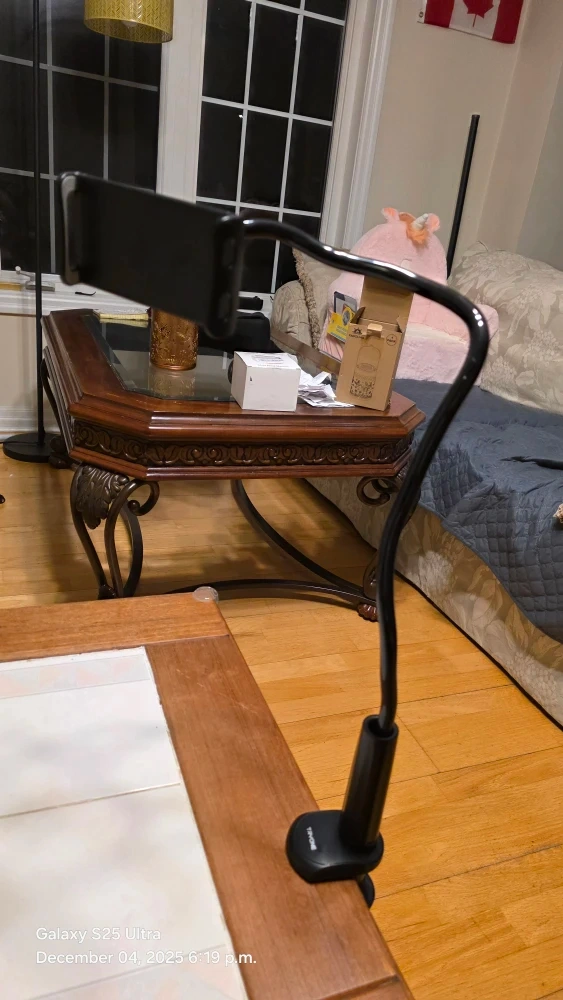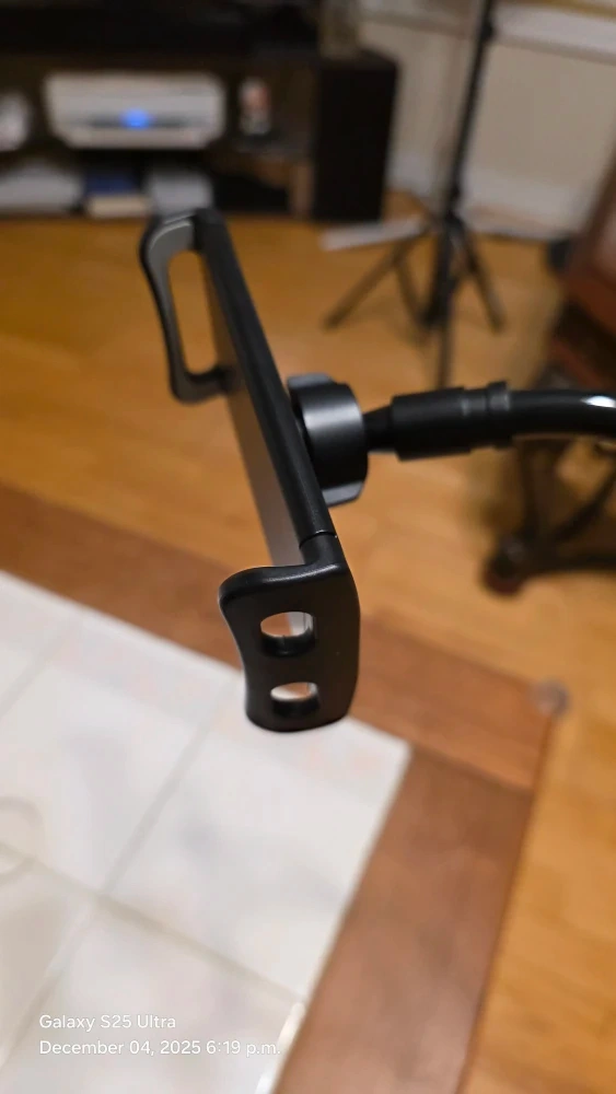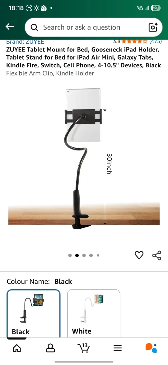 Selling a tryone tablet mount in black. It's a gooseneck iPad holder, perfect for use in bed. It can hold iPad Air Minis, Galaxy Tabs, Kindle Fires, and cell phones with screen sizes from 4 to 10.5 inches. The arm is flexible and has a clip for easy attachment