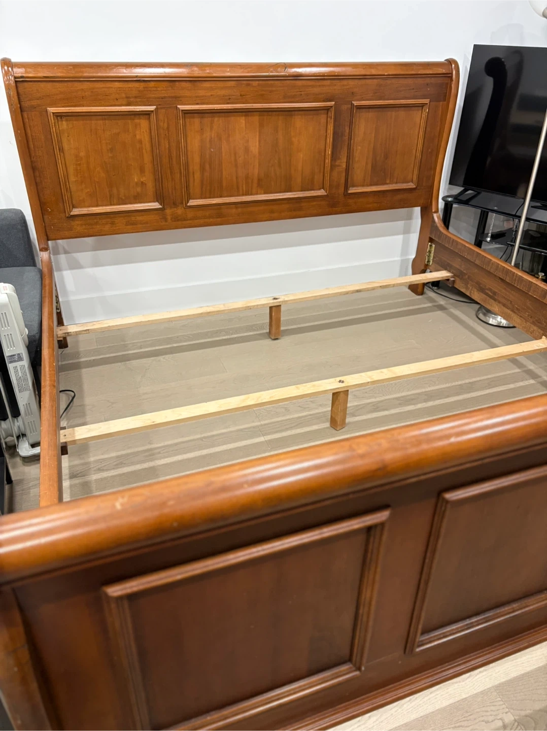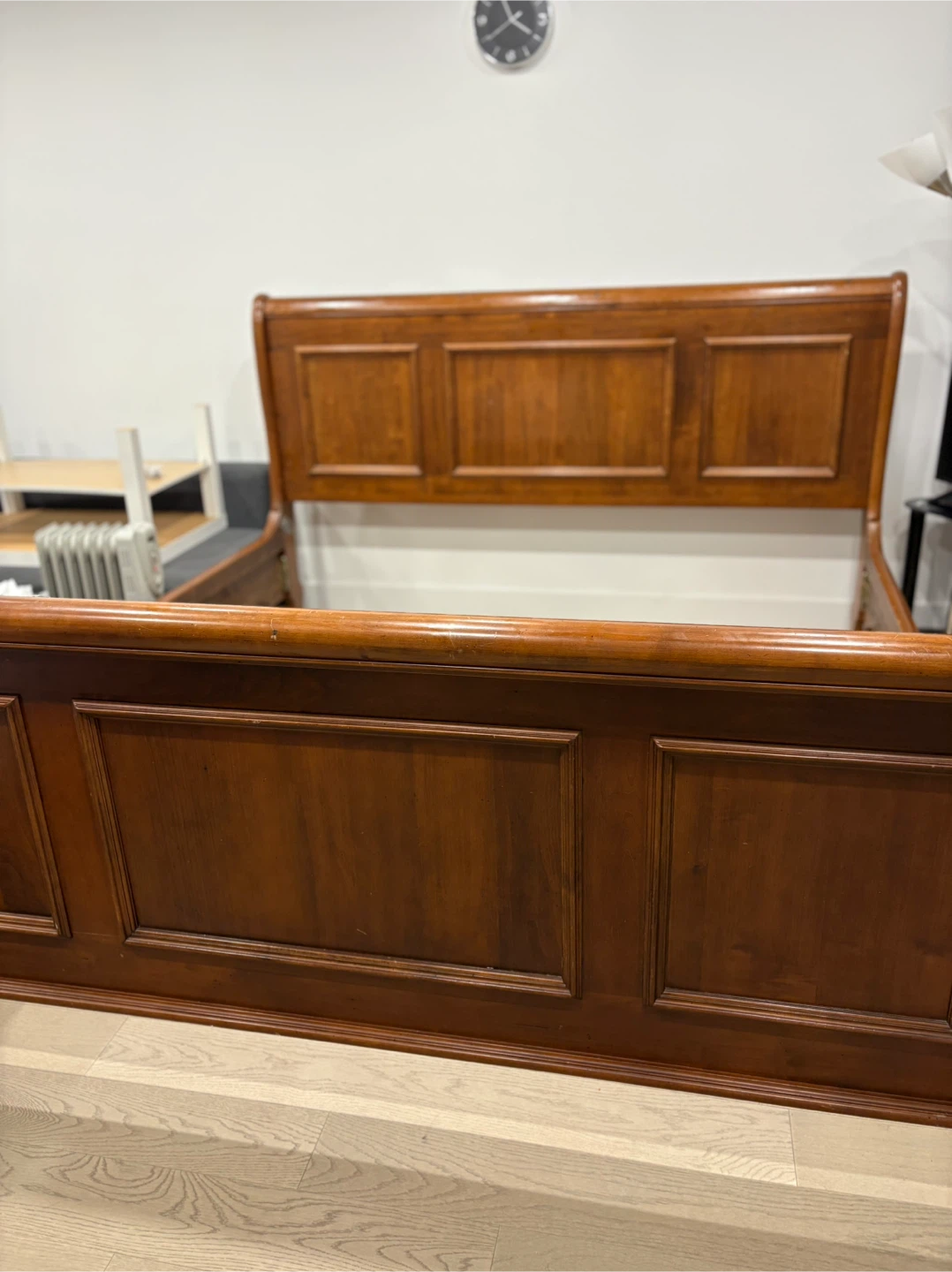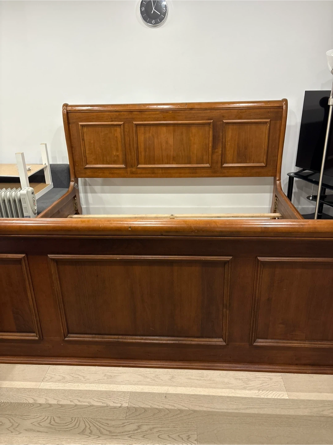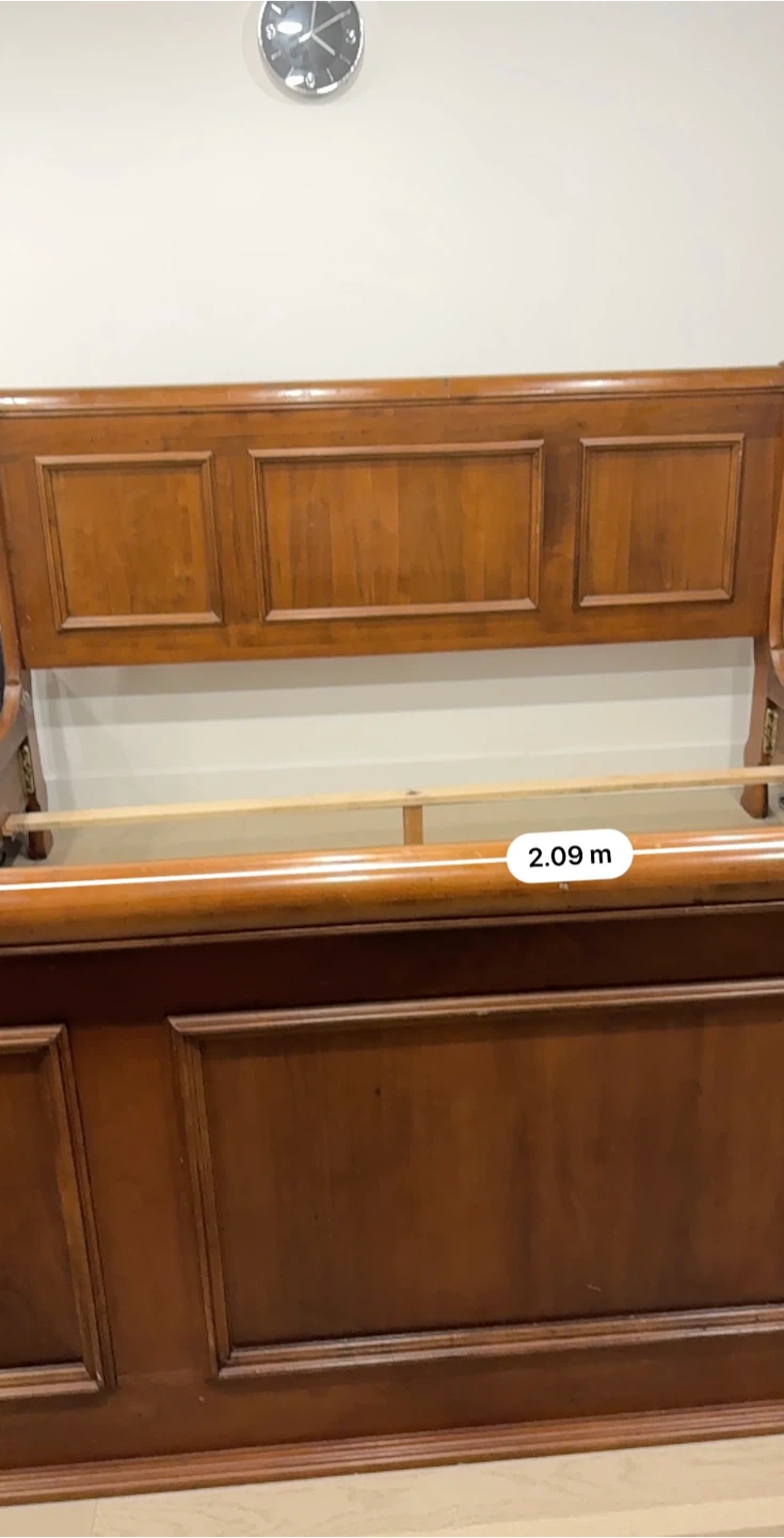 Selling a wooden sleigh bed frame. The headboard measures approximately 1.05 meters in height and the overall length is about 2.09 meters. Perfect for adding a touch of classic elegance to your bedroom!