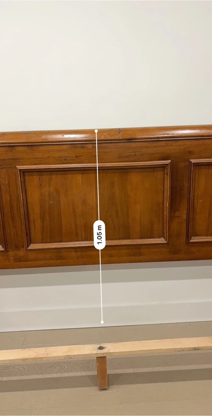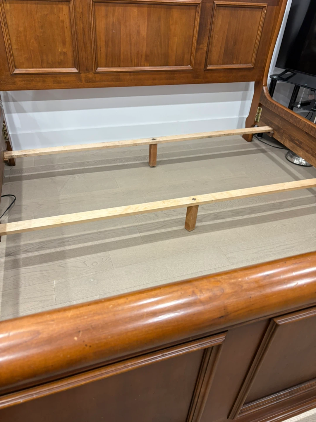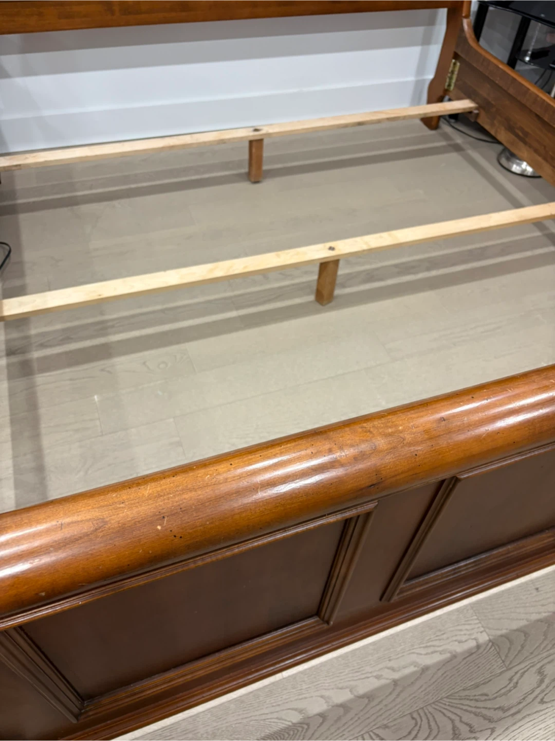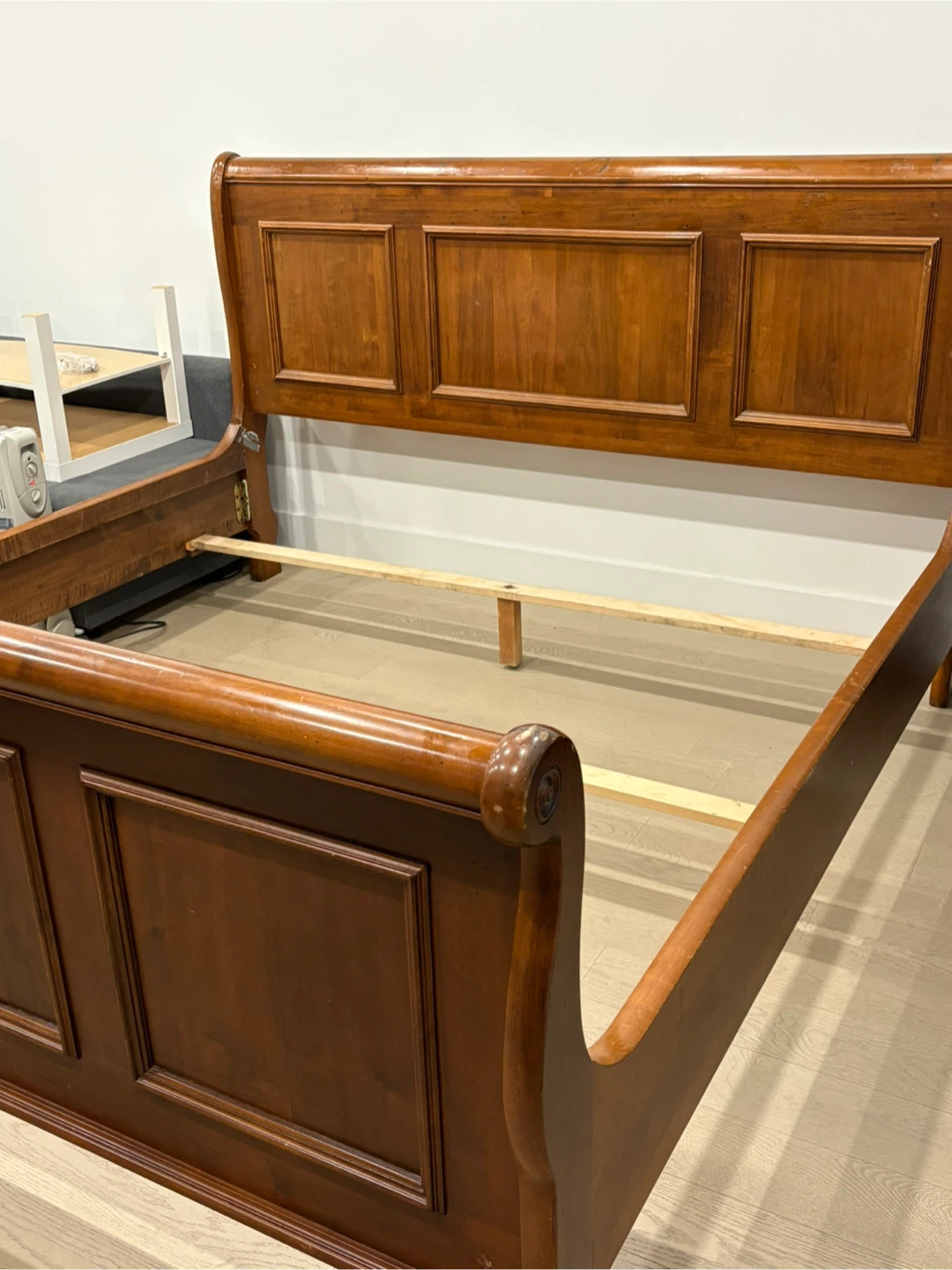 Selling a wooden sleigh bed frame. The headboard measures approximately 1.05 meters in height and the overall length is about 2.09 meters. Perfect for adding a touch of classic elegance to your bedroom!