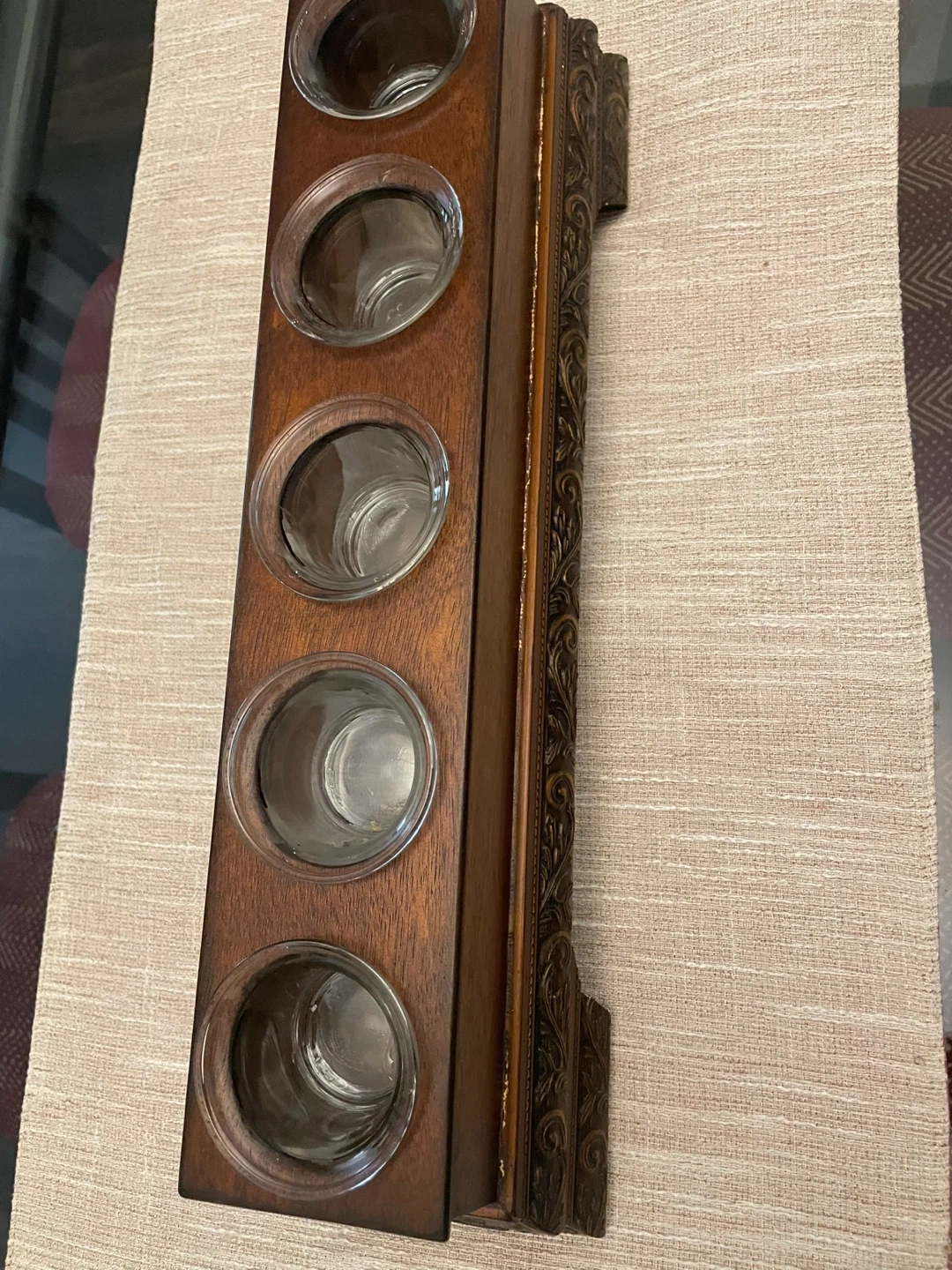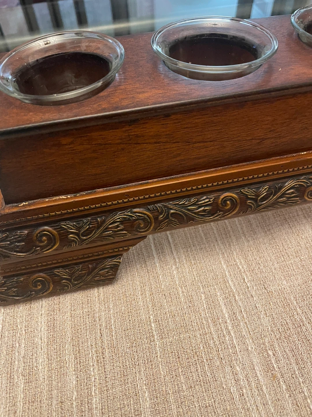Selling a lovely new wooden candle holder that has five glass inserts. It would look beautiful in any home. Can be used as a mantle piece or a dinner table center piece. The wood has a rich, dark finish with decorative carvings.