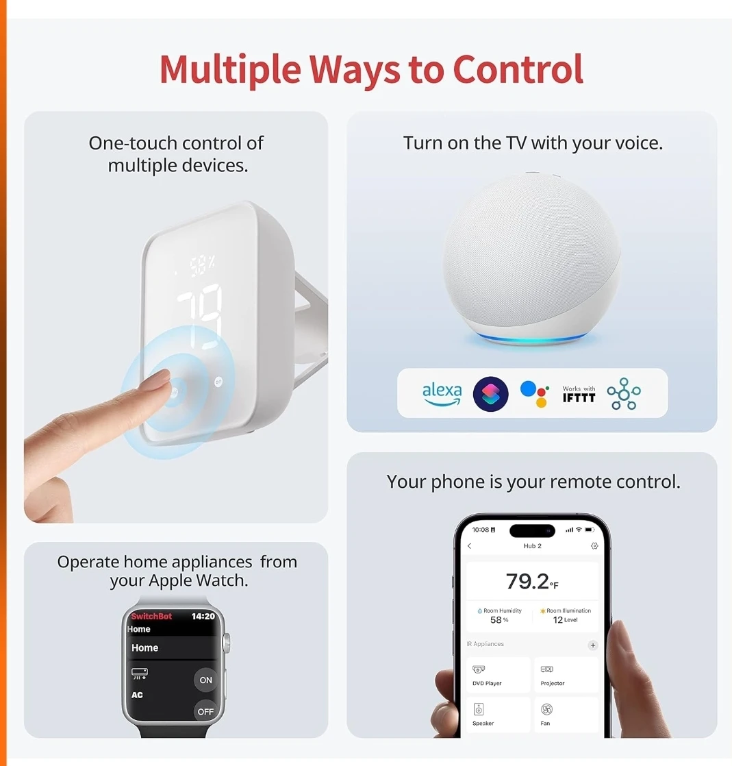 Check out this handy SwitchBot Hub 2! It's a 4-in-1 smart home hub that includes a Wi-Fi thermo-hygrometer. It also supports HomeKit via Matter, so you can use it with SwitchBot Curtain and Blind Tilt via Apple Home. It can even make your old appliances smarter by transforming old infrared remote devices into easy-to-use smart devices! It monitors the temperature at home, no matter where you are, and has a temp accuracy of ±0.4°F and humidity accuracy of ±2%RH
