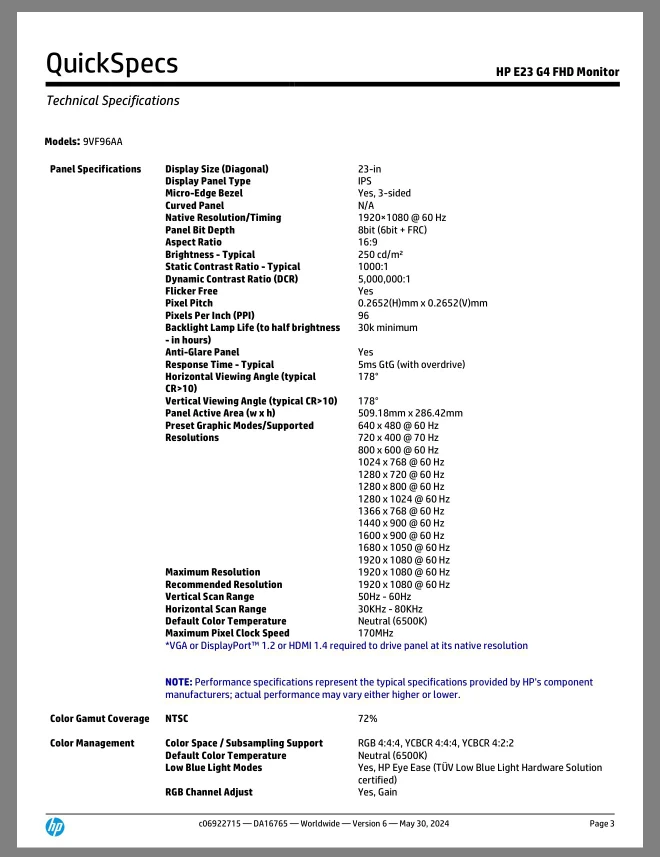 Selling an HP E23 G4 FHD monitor! It's a 23-inch IPS display with a 1920x1080 resolution. It has DisplayPort, HDMI, and VGA ports. The response time is 5ms GtG with overdrive. Feel free to reach out if you're interested!