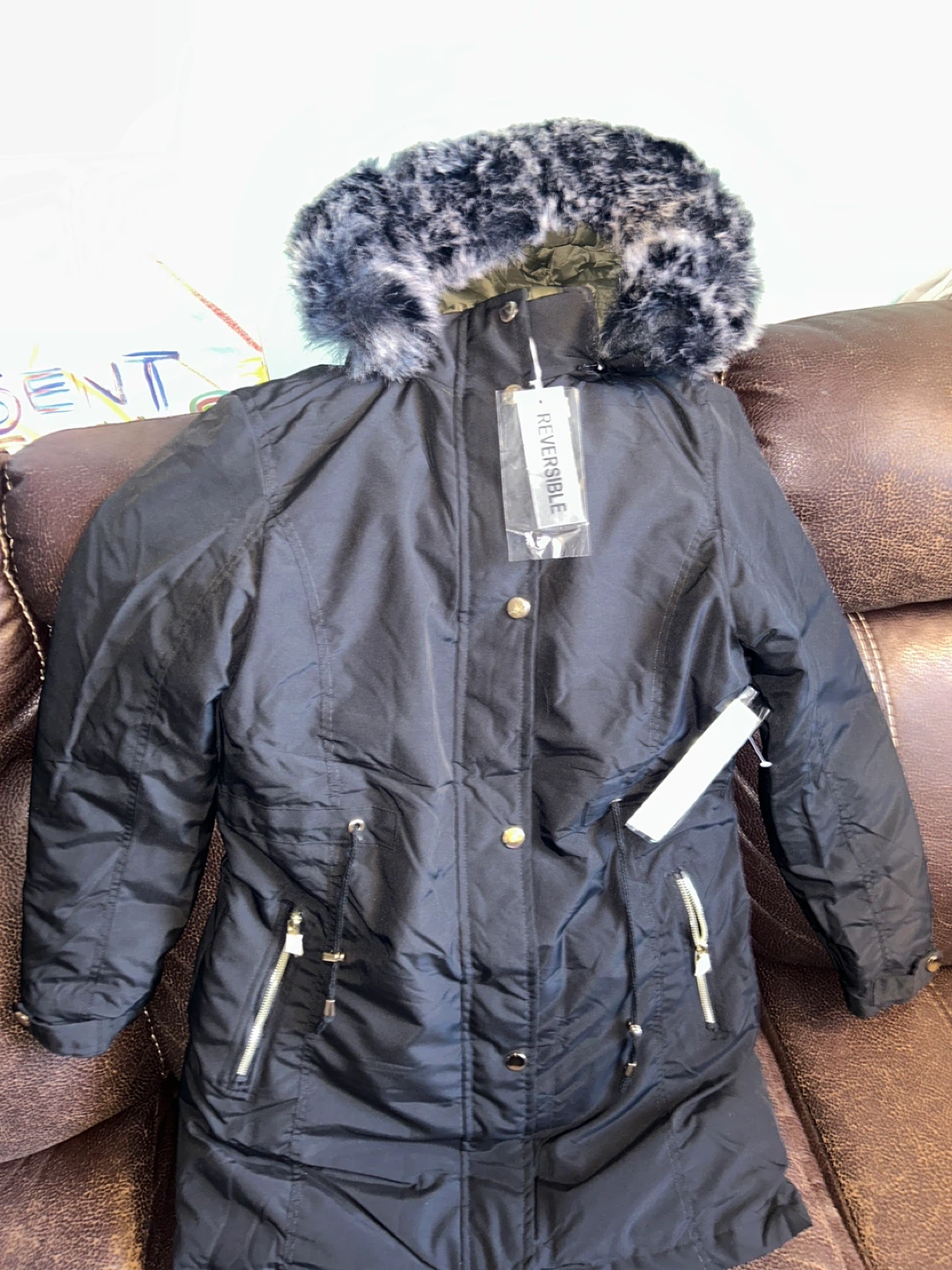 This is a reversible puffer coat that features a faux fur hood! The coat is black on one side and a light olive green on the other. It has gold colored zippers and buttons. It's in great condition and ready for the cold weather