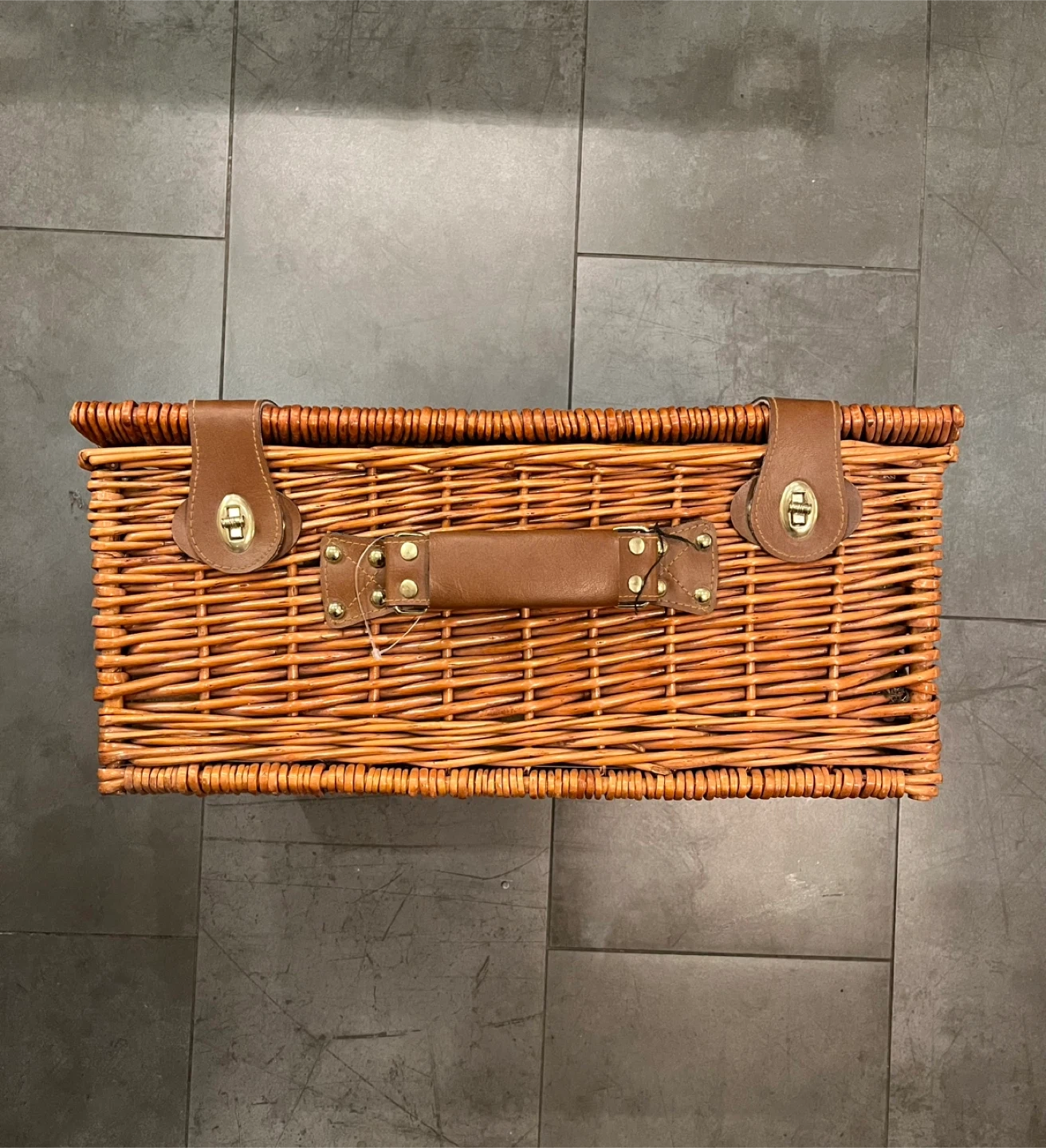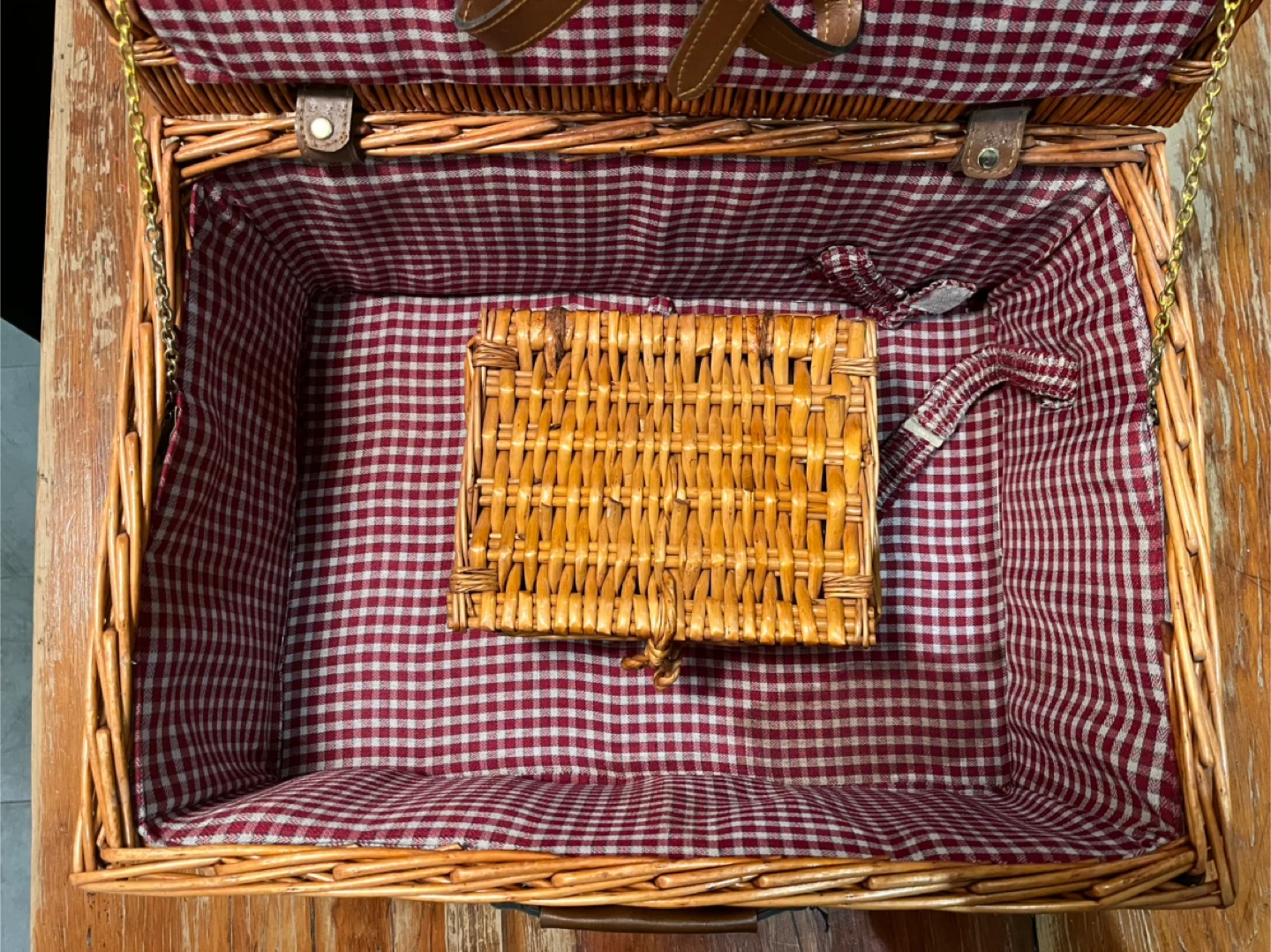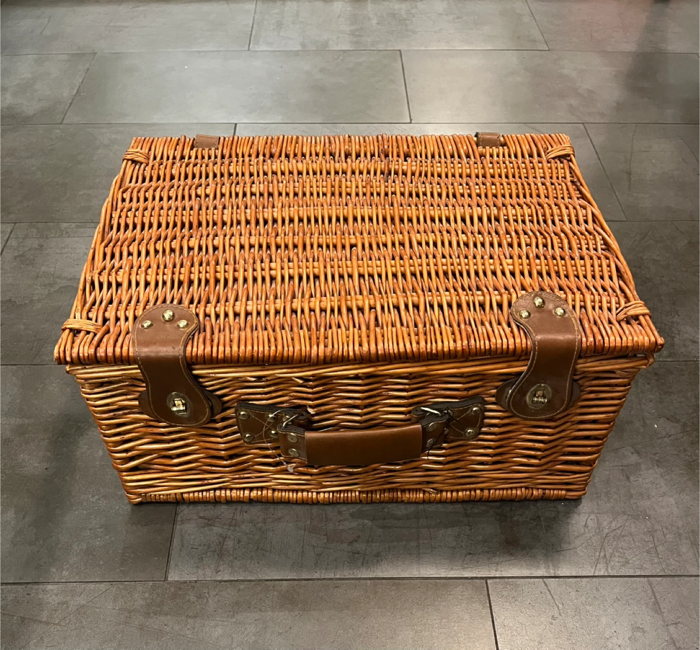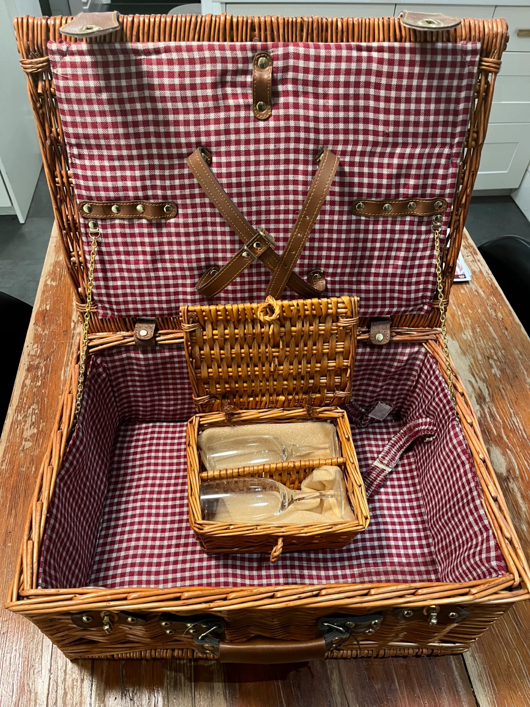 Selling a lovely wicker picnic basket! It comes with two glasses nestled in their own little basket. The inside is lined with a red and white checkered fabric. Never been used!