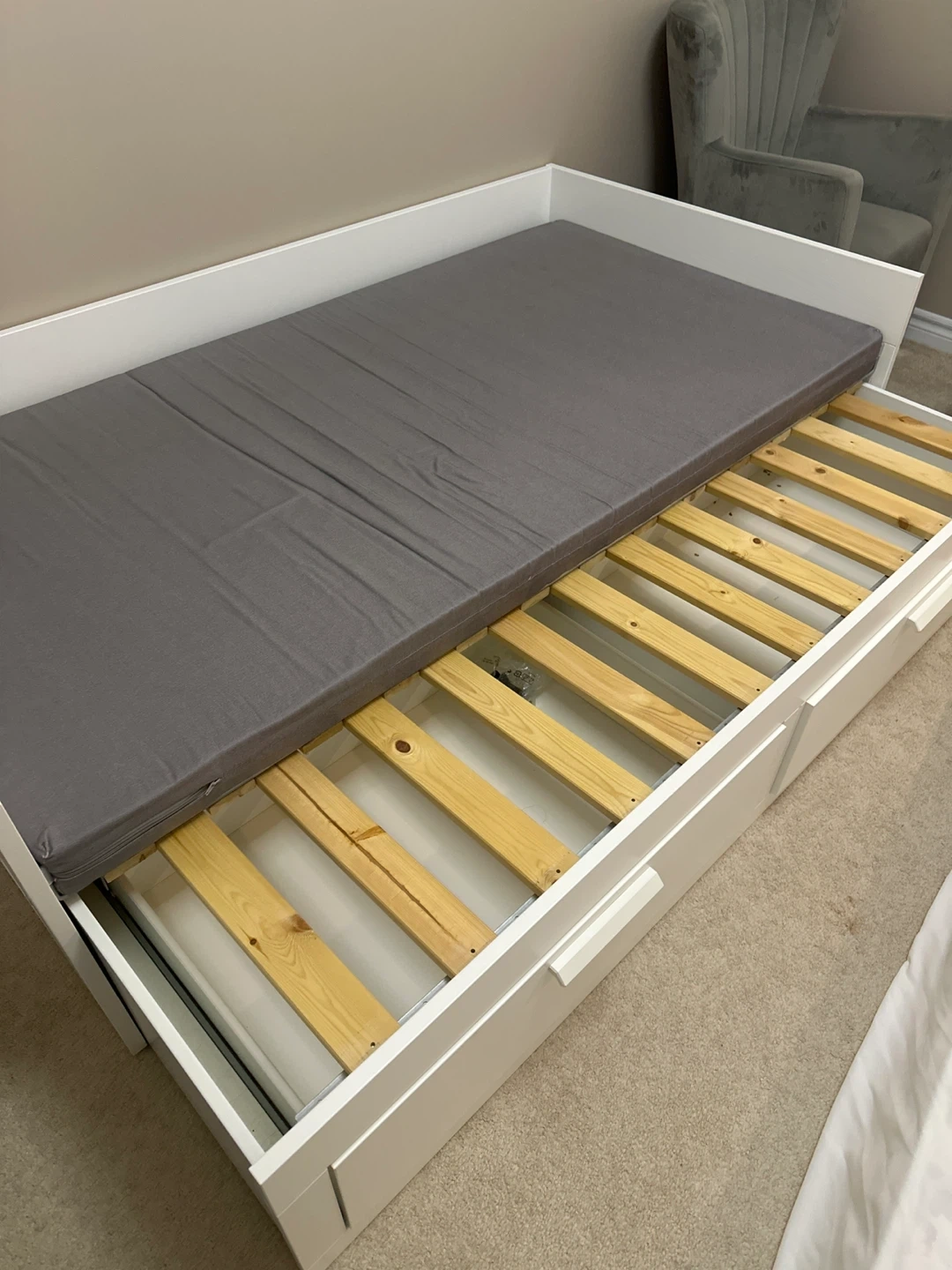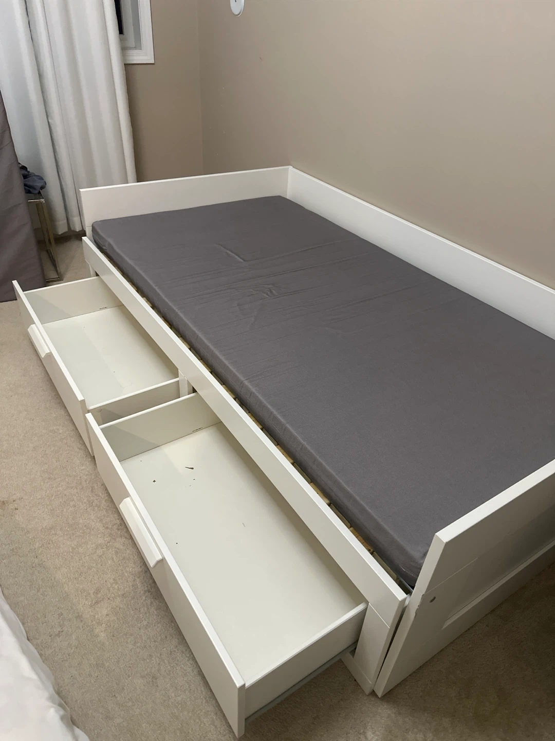 Selling Ikea Brimnes daybed in great condition! It's white and comes with drawers for extra storage. Also includes two mattress. Perfect for a guest room or a kid's room! The bed can transform into a king bed. Both mattresses can be used on top of each other or spread them for the king bed.