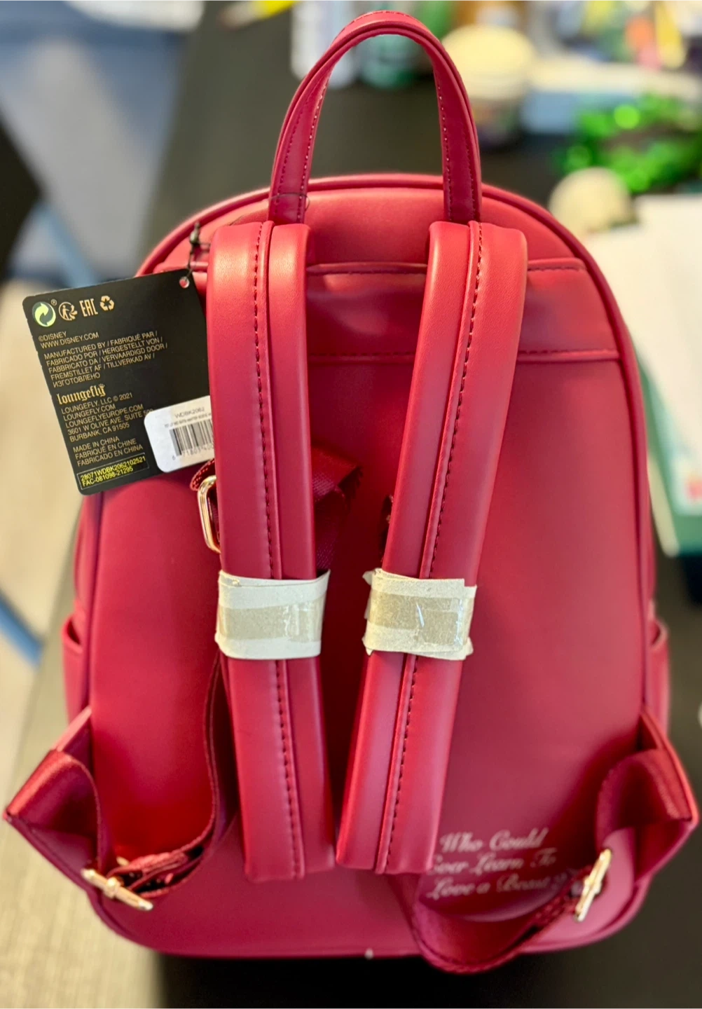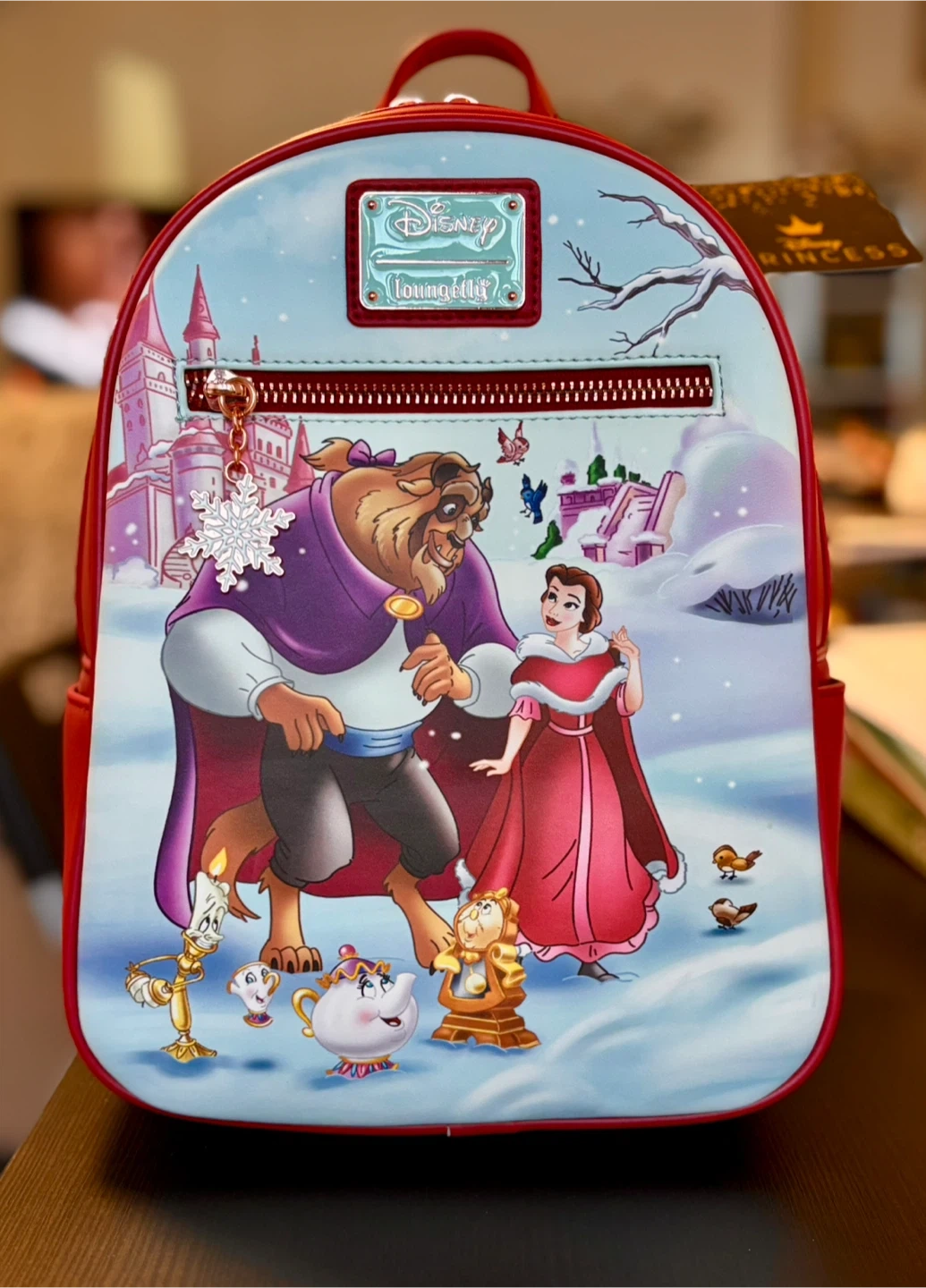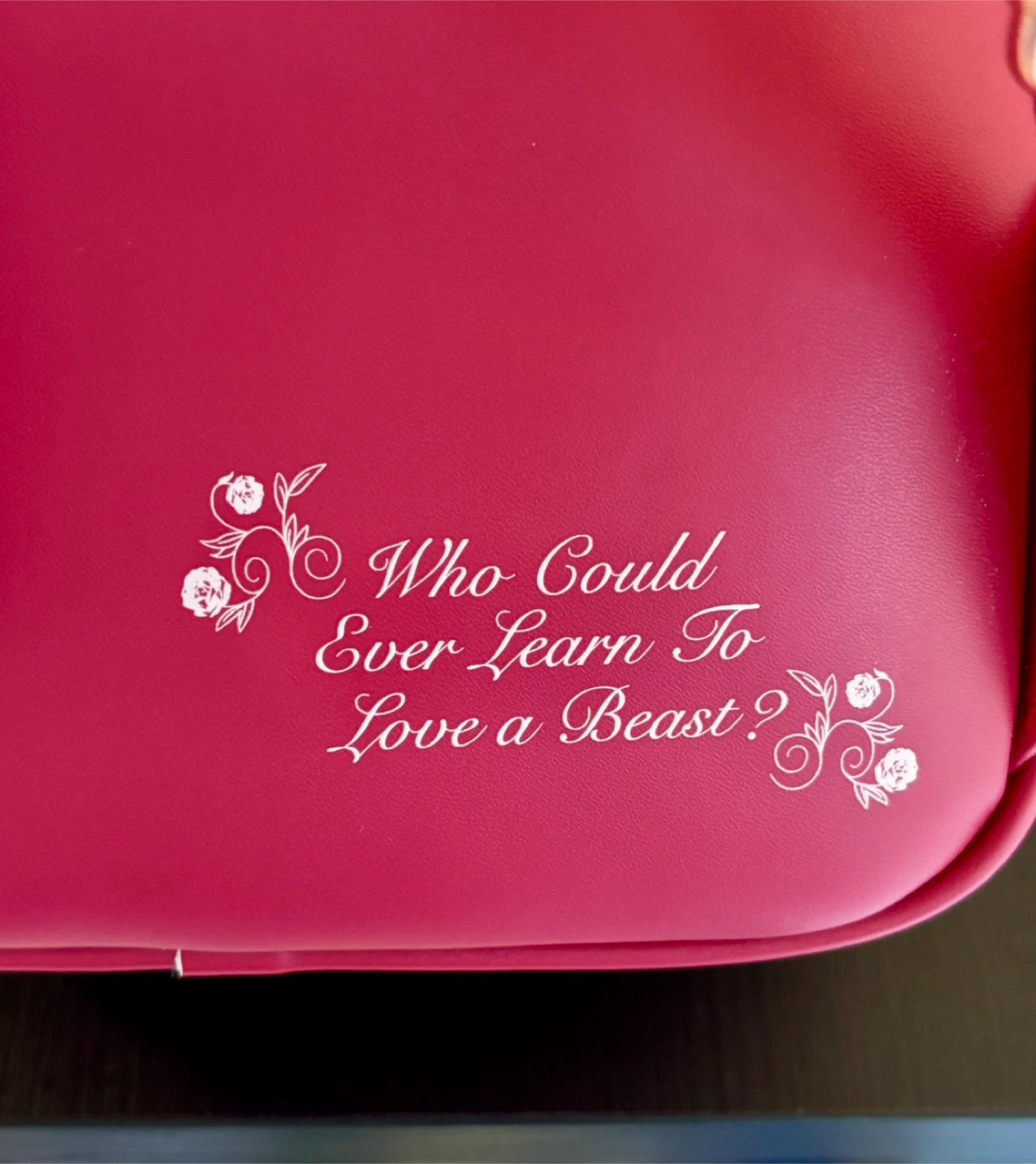 The bag features 3 outer pockets, rose gold zippers & snowflake charm as well as a quote on the back, “Who could ever learn to love a Beast.” As pictured in last slide.