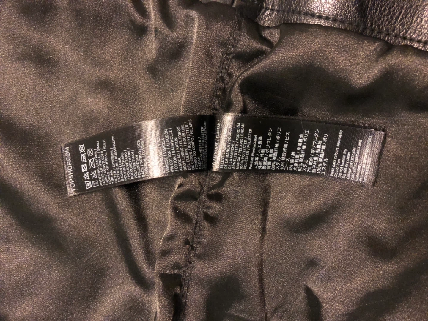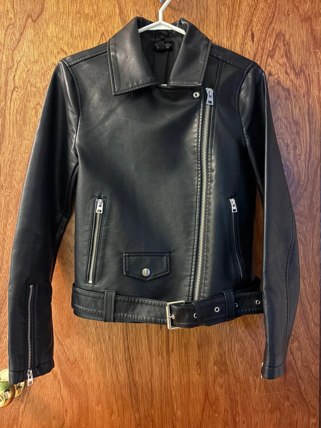 Selling a Topshop black faux leather biker jacket. Perfect for adding an edgy touch to any outfit. It's in great condition and ready for a new owner! The size is US 4.
