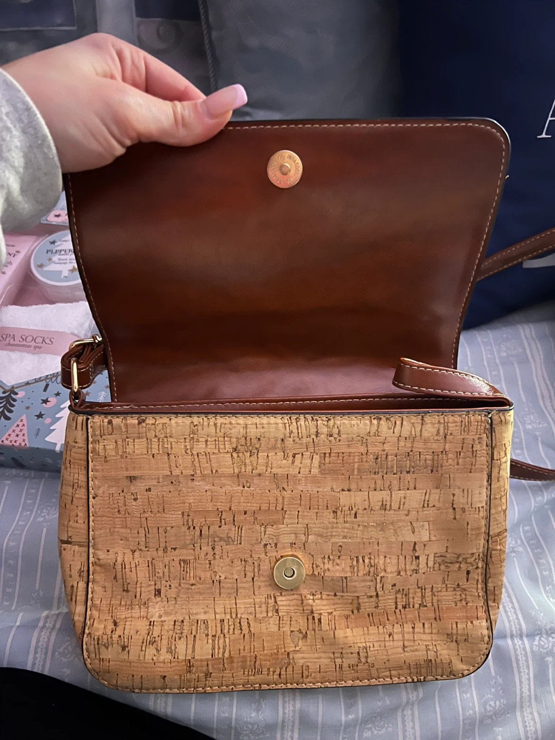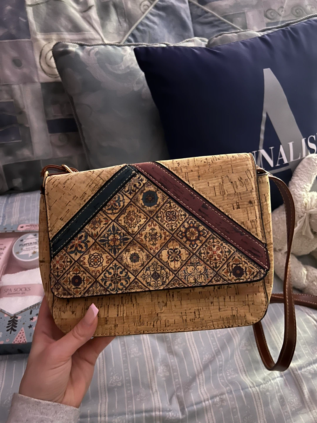 Here's a cute brown crossbody bag bought in Lisbon, Portugal! It's made of cork and has a unique design on the front flap. The inside has a zipper pocket and other compartments to keep your things organized