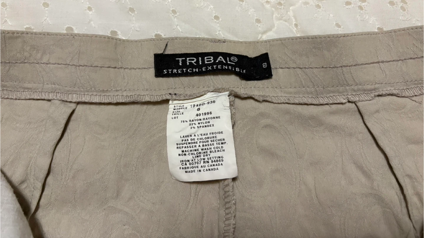 These are a pair of size 8 Tribal brand pants that feature a stylish and subtle pattern, perfect for adding a touch of elegance to your wardrobe. These used pants offer a comfortable fit and a unique look, ready to be styled for various occasions.
