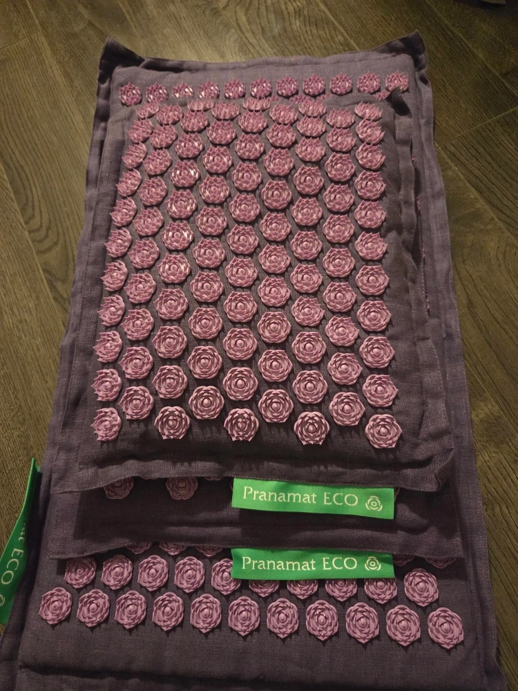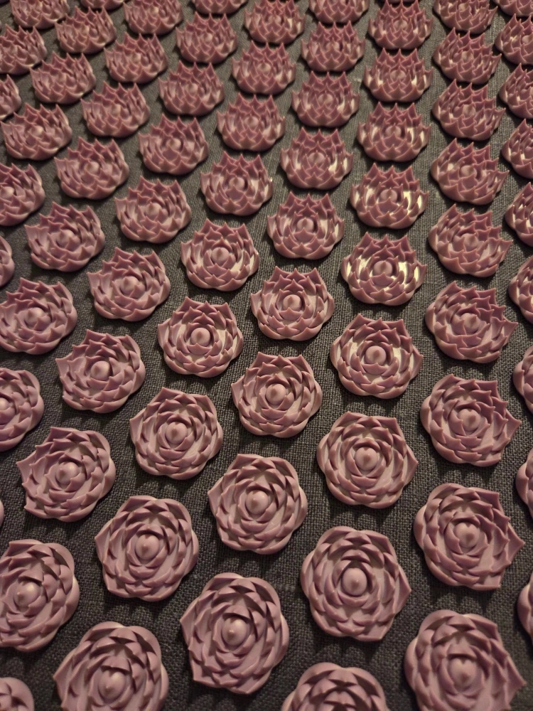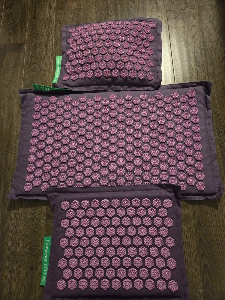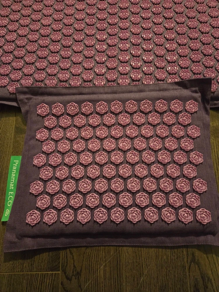 tures a surface with thousands of plastic lo- tus-shaped spikes that press against the skin to stimulate points on the body, which can help release endorphins for pain relief and promote relaxation. These mats are often made from eco-friendly materials like linen, cotton, and coconut fiber