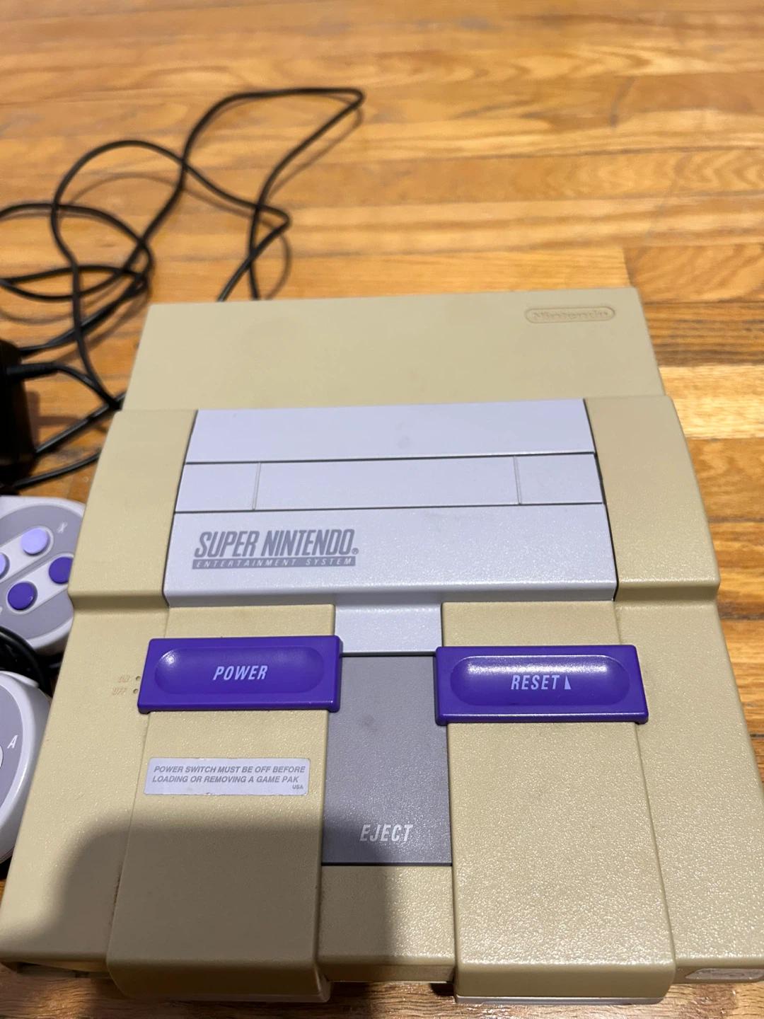 Selling a used Super Nintendo Entertainment System! It comes with two controllers and the power adapter. It's in good condition and ready for some retro gaming fun.