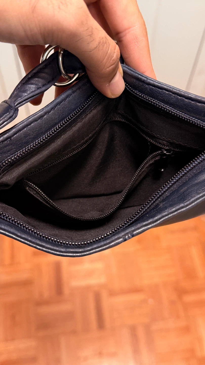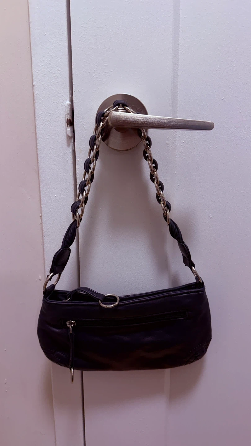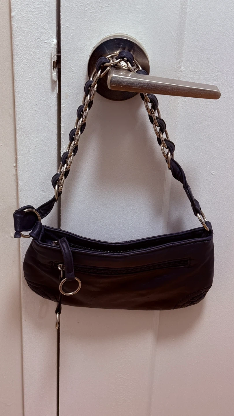 A cute navy blue shoulder bag with a chain strap! It's in great condition and perfect for carrying your essentials. The interior has a zipper pocket for extra security