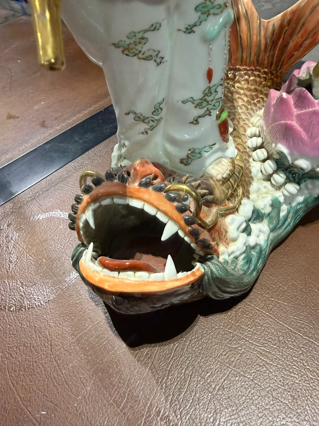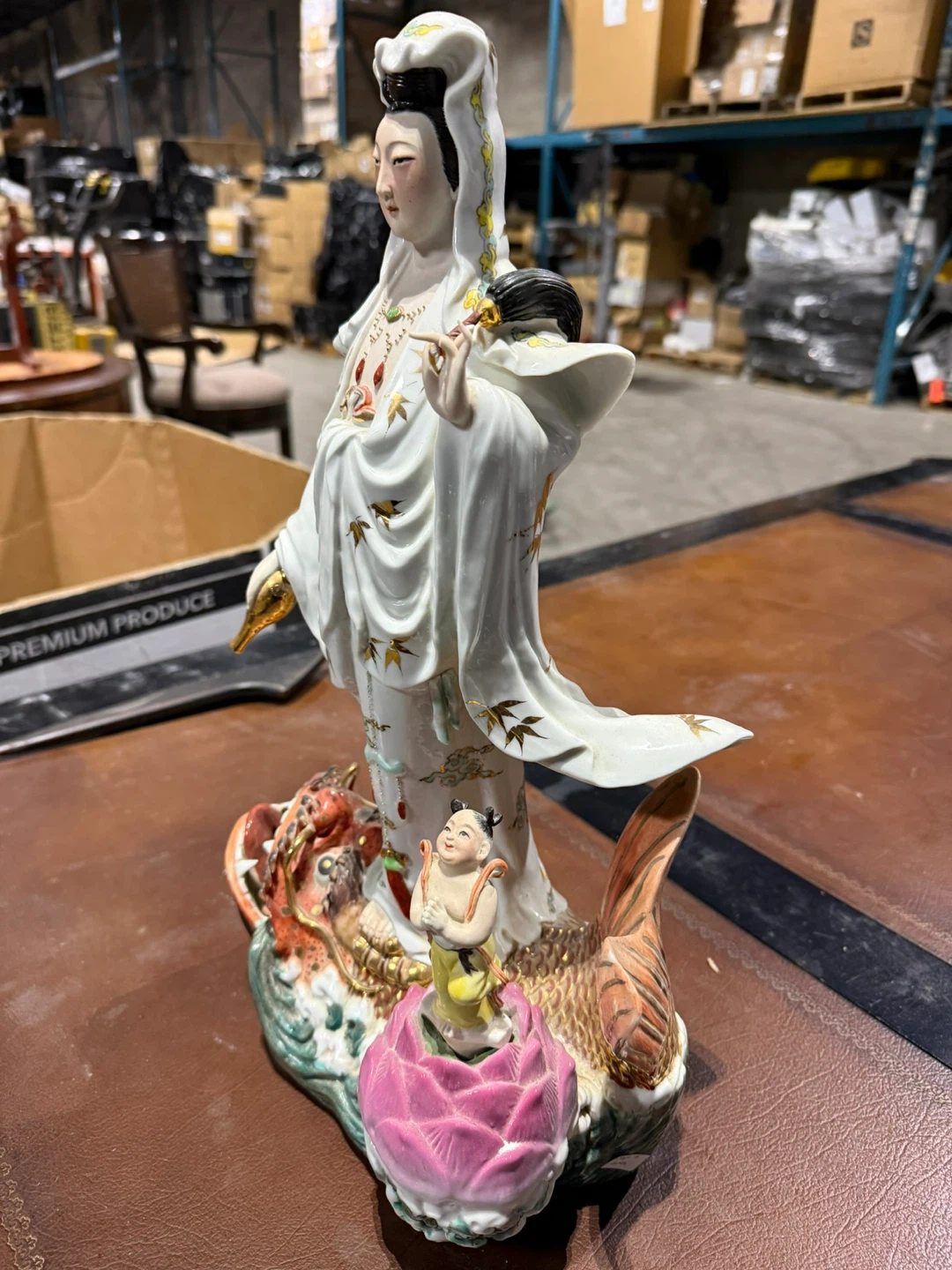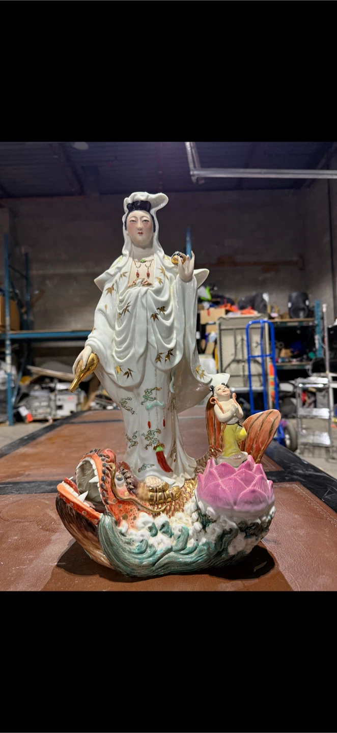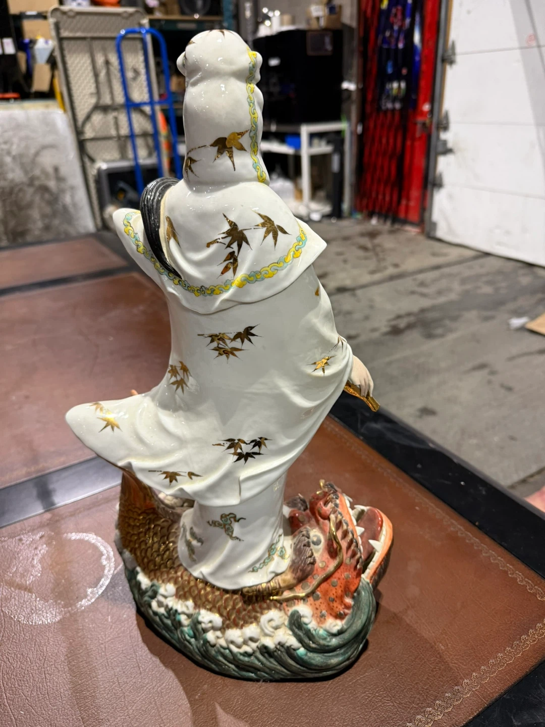 Selling a beautiful 20th Century Chinese porcelain statue featuring Guanyin standing on a Shachihoko. It measures H 17 1/2". This unique piece would make a great addition to any collection!