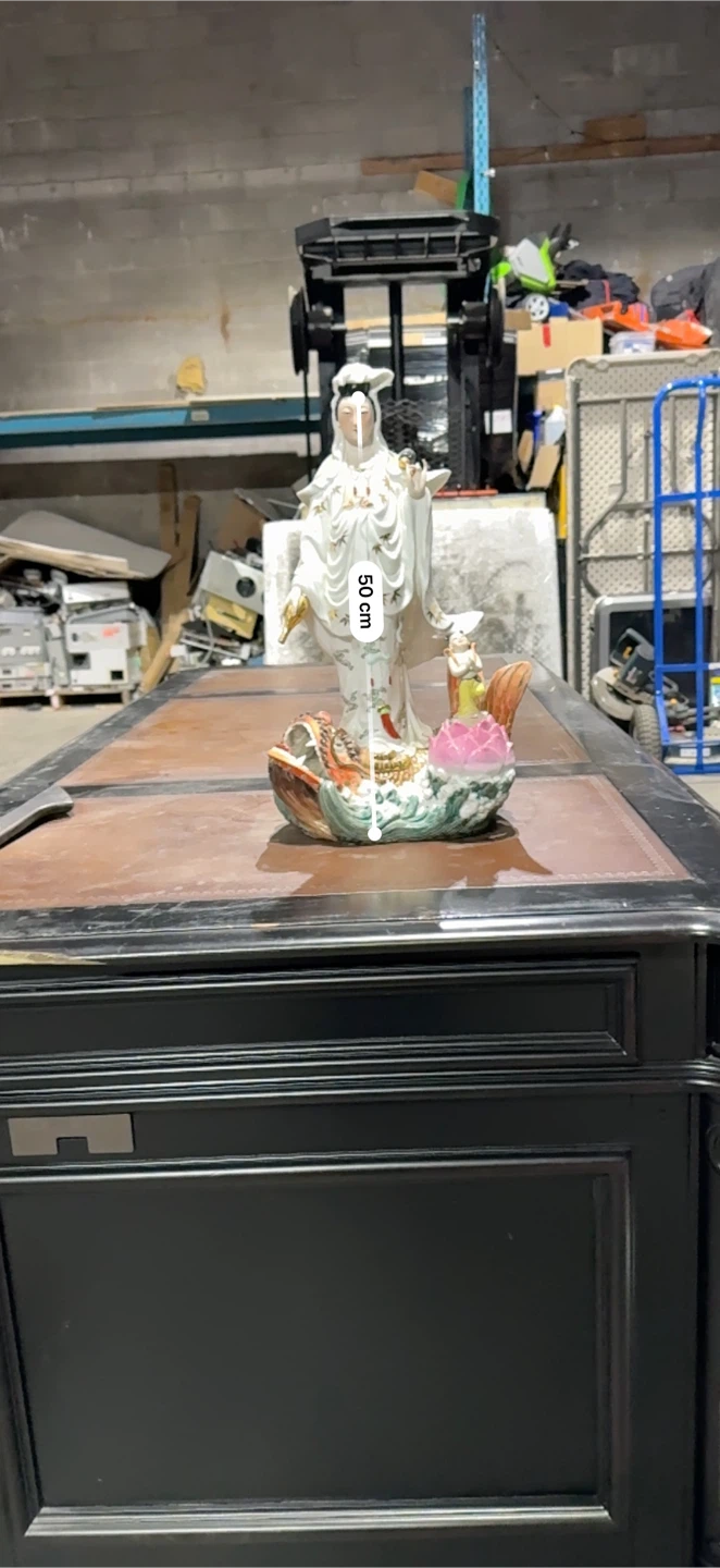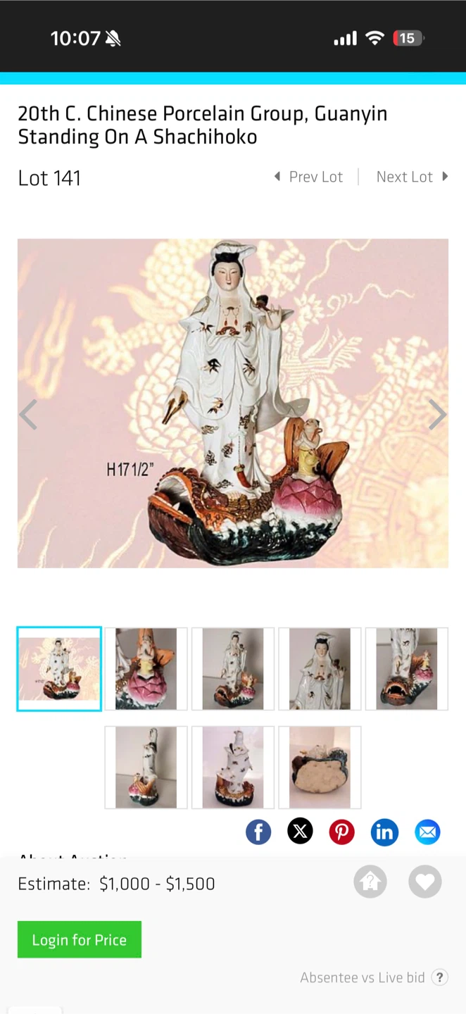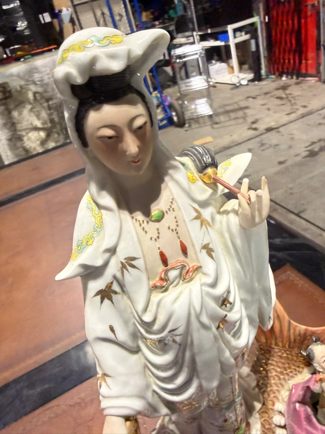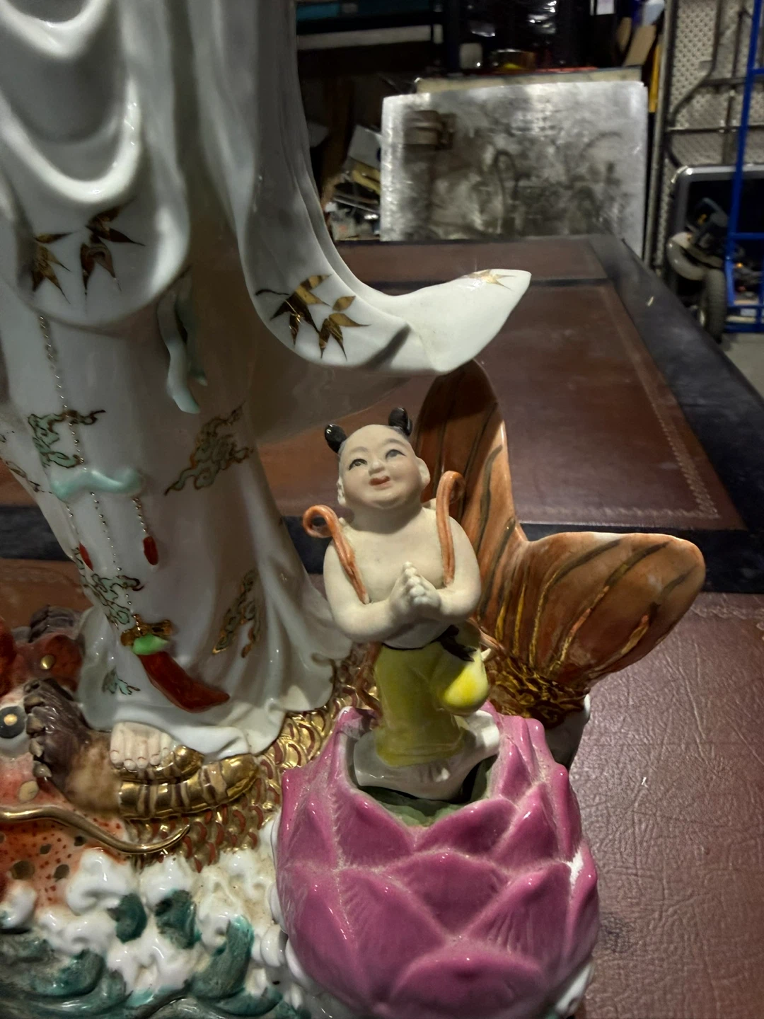 Selling a beautiful 20th Century Chinese porcelain statue featuring Guanyin standing on a Shachihoko. It measures H 17 1/2". This unique piece would make a great addition to any collection!