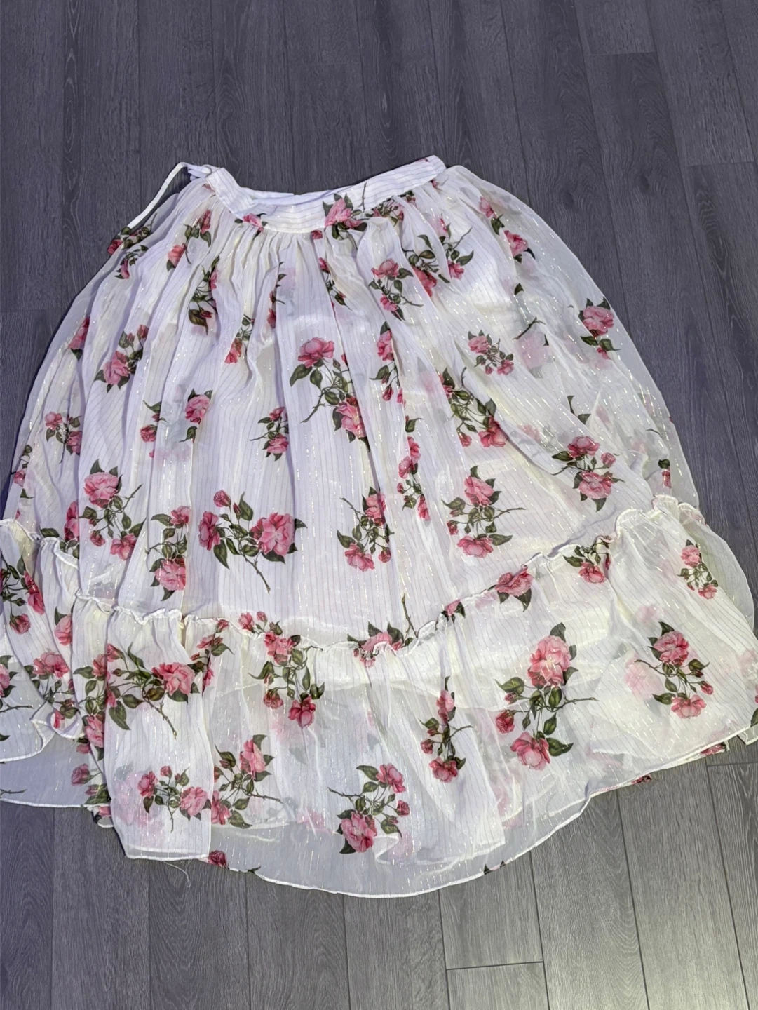 Here's a charming top and skirt set featuring a lovely floral pattern. The top has a unique design with delicate straps, and the skirt complements it perfectly with its flowing style. A great addition to your wardrobe!