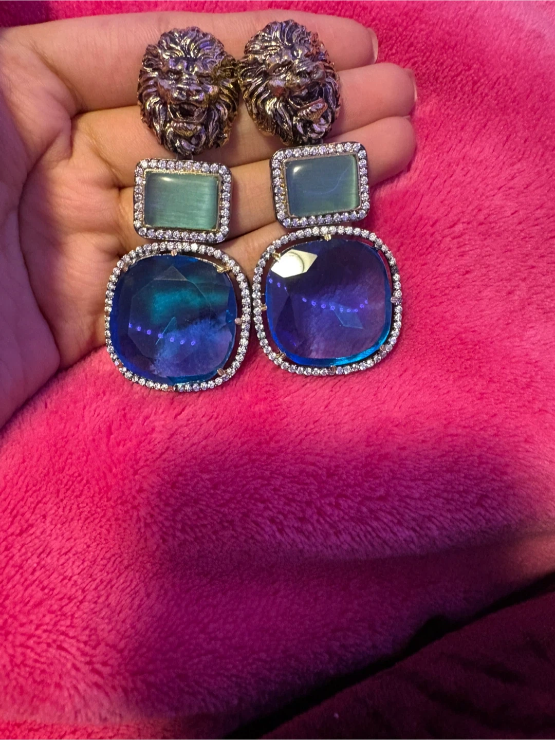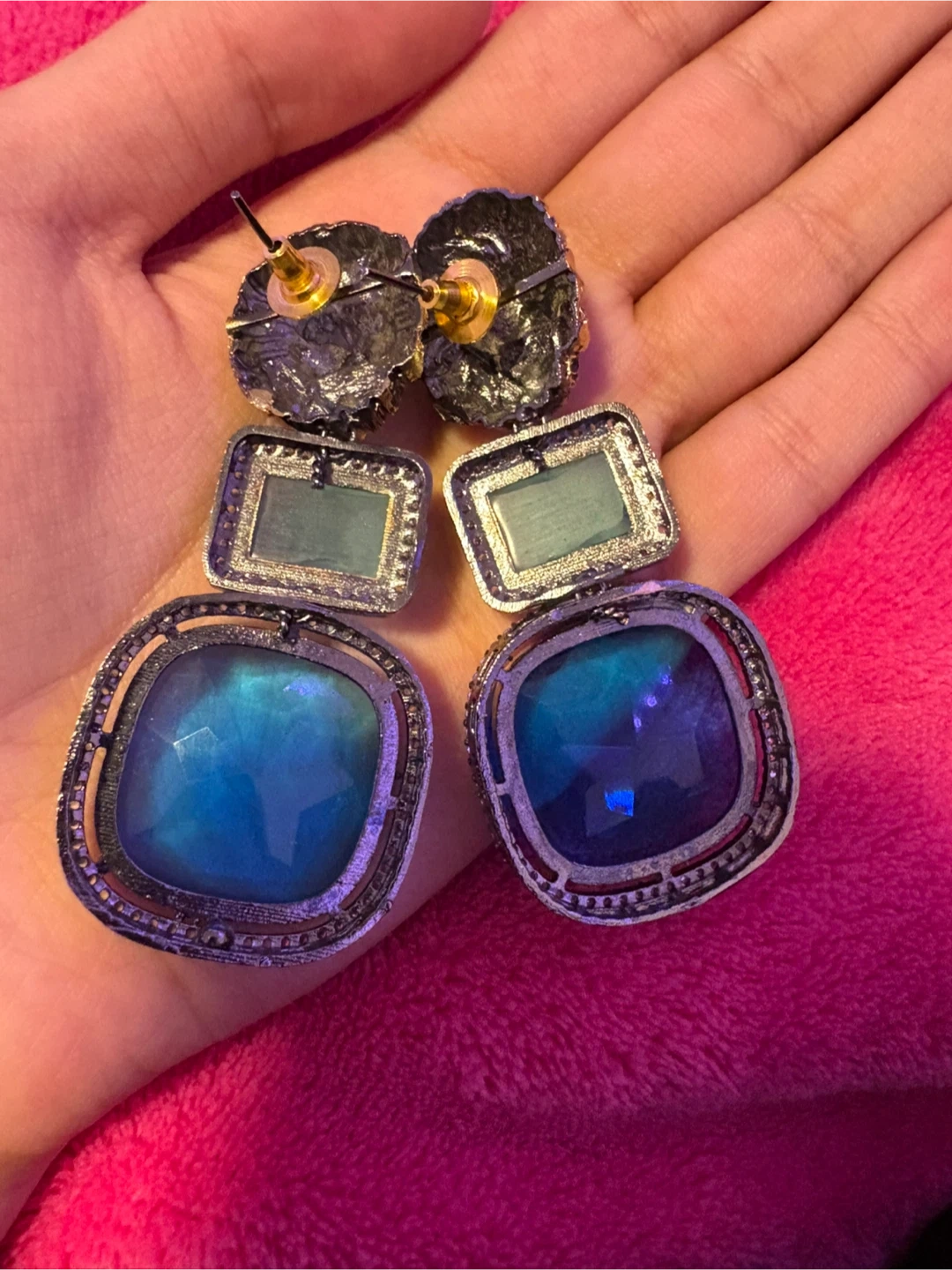 Selling a pair of statement earrings with a unique design! They feature a combination of blue and silver tones. The earrings have a bold, eye-catching look that's perfect for adding a touch of glamour to any outfit