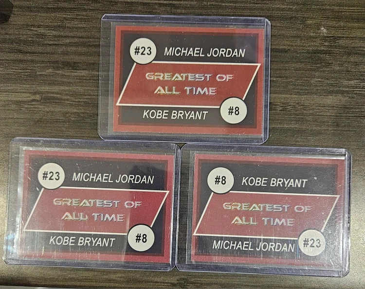 Selling a set of trading cards featuring Kobe Bryant and Michael Jordan. These cards are in great condition and would be perfect for any basketball fan or collector! Each card highlights the 'Greatest of All Time' with their respective numbers #8 and #23