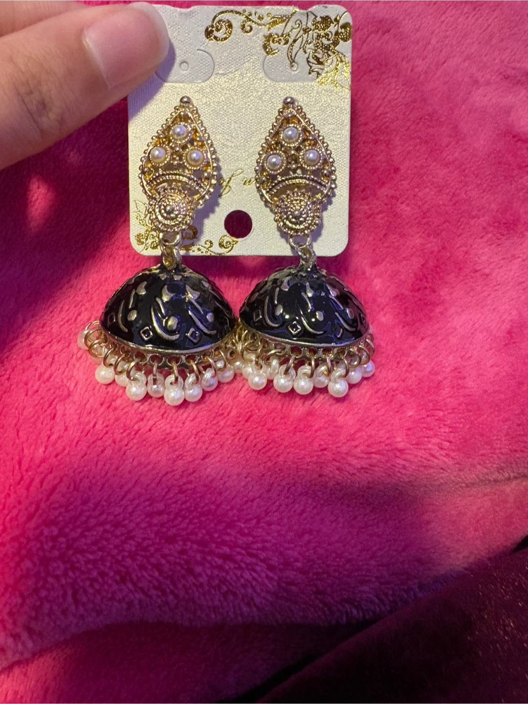 Selling a pair of lovely black jhumka earrings! These earrings feature a beautiful gold design with pearl accents. They're perfect for adding a touch of elegance to any outfit!