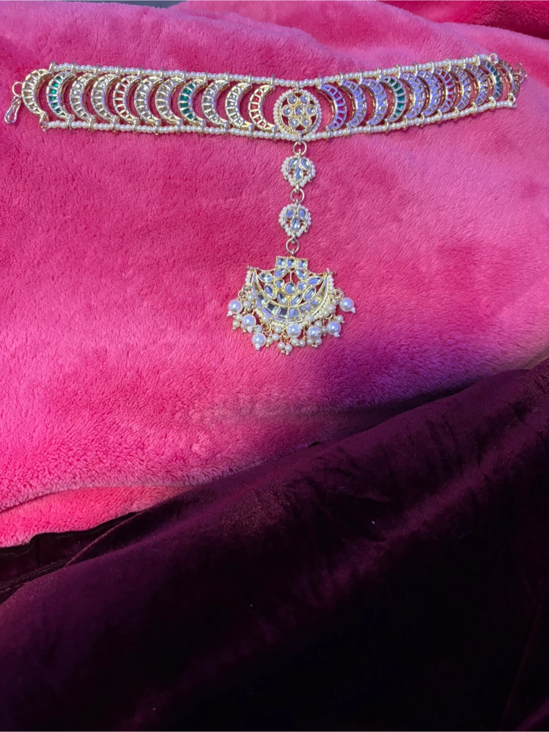 Beautiful Indian bridal Matha Patti headpiece. It features intricate detailing with pearls and mirrored accents. Perfect for weddings or special occasions!
