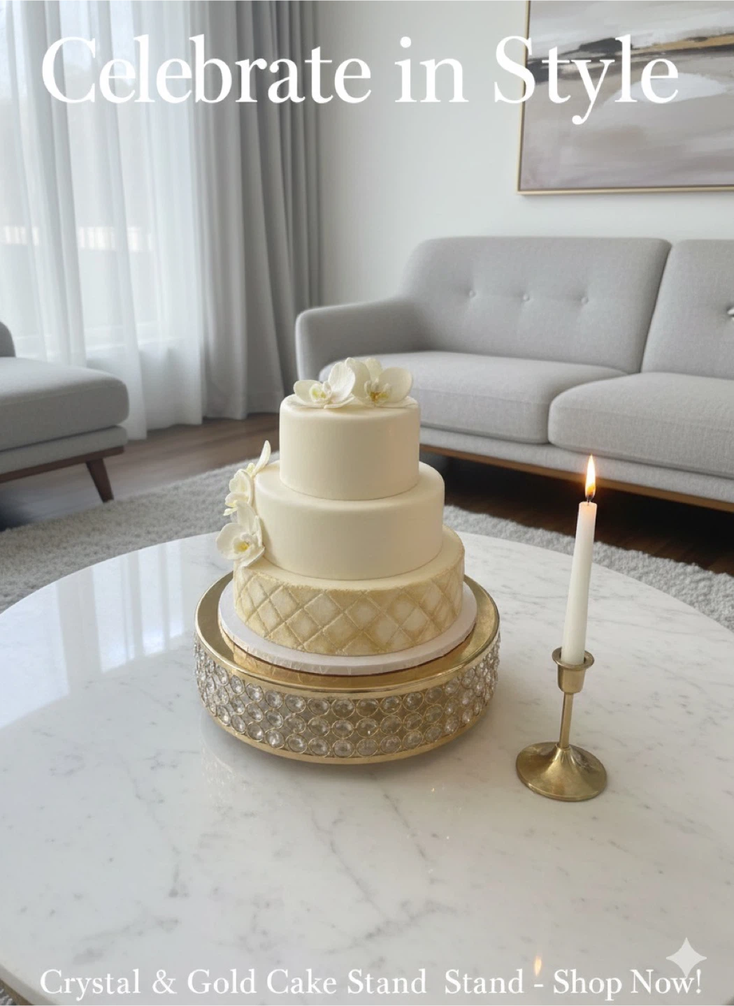 Selling a lovely crystal and gold cake stand. It's perfect for displaying cakes or other desserts in style. The stand features a gold-tone base adorned with sparkling crystals, adding a touch of elegance to any occasion