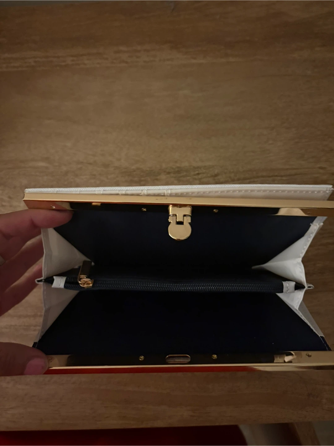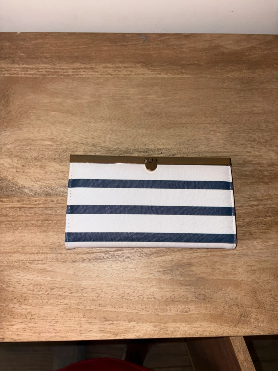 Here's a cute wallet with a blue and white striped design! It has a gold-tone clasp and a zippered compartment inside. Perfect for keeping your cards and cash organized
