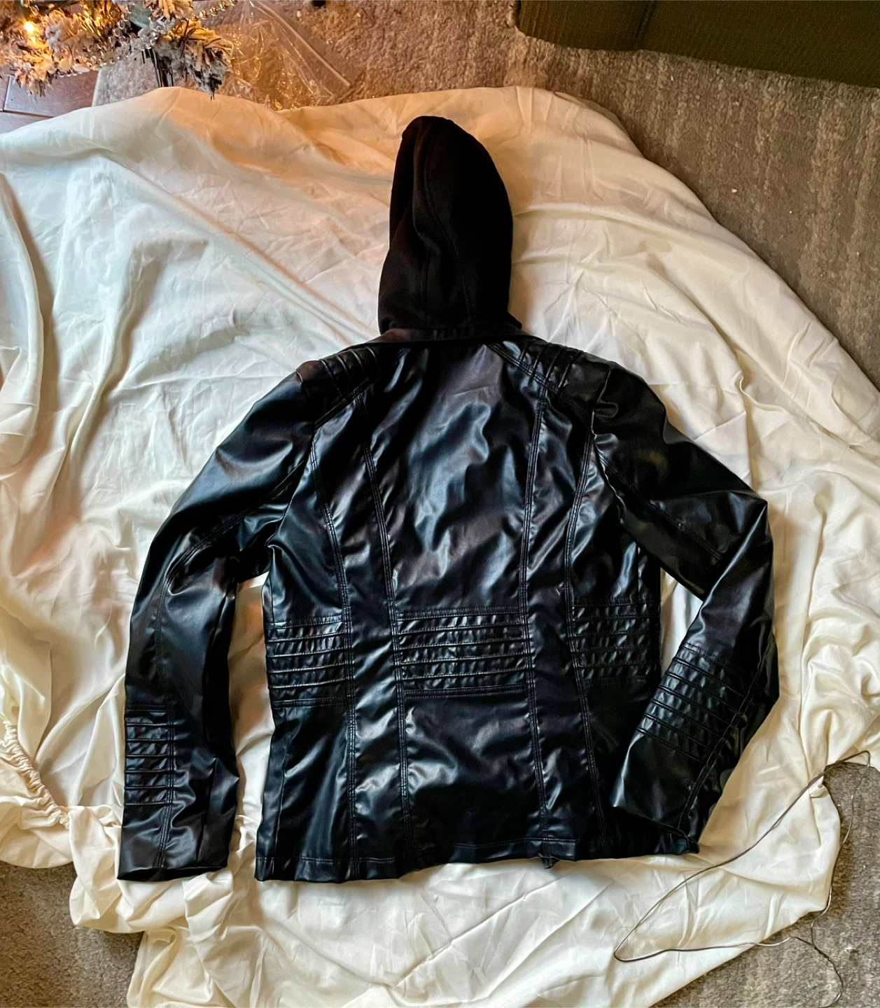 Selling a black faux leather jacket with a hood. Hood is removable,It's in great condition and perfect for adding a bit of edge to your wardrobe. The jacket features a zip-up front and stylish detailing on the sleeves and back. It's a versatile piece that can be dressed up or down! Inner zipper and outer zipper