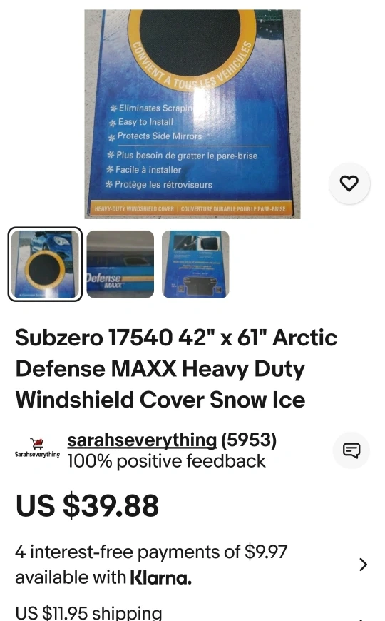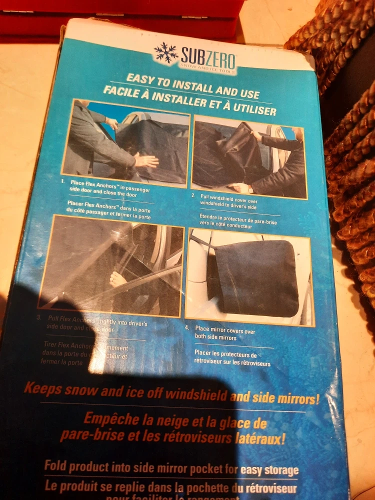 Selling a brand new Subzero ArcticDefense MAXX windshield cover! This cover is designed to fit all vehicles and keeps snow and ice off your windshield and side mirrors. It's easy to install and use, and it folds into the side mirror pocket for easy storage. Originally bought for $39.88.