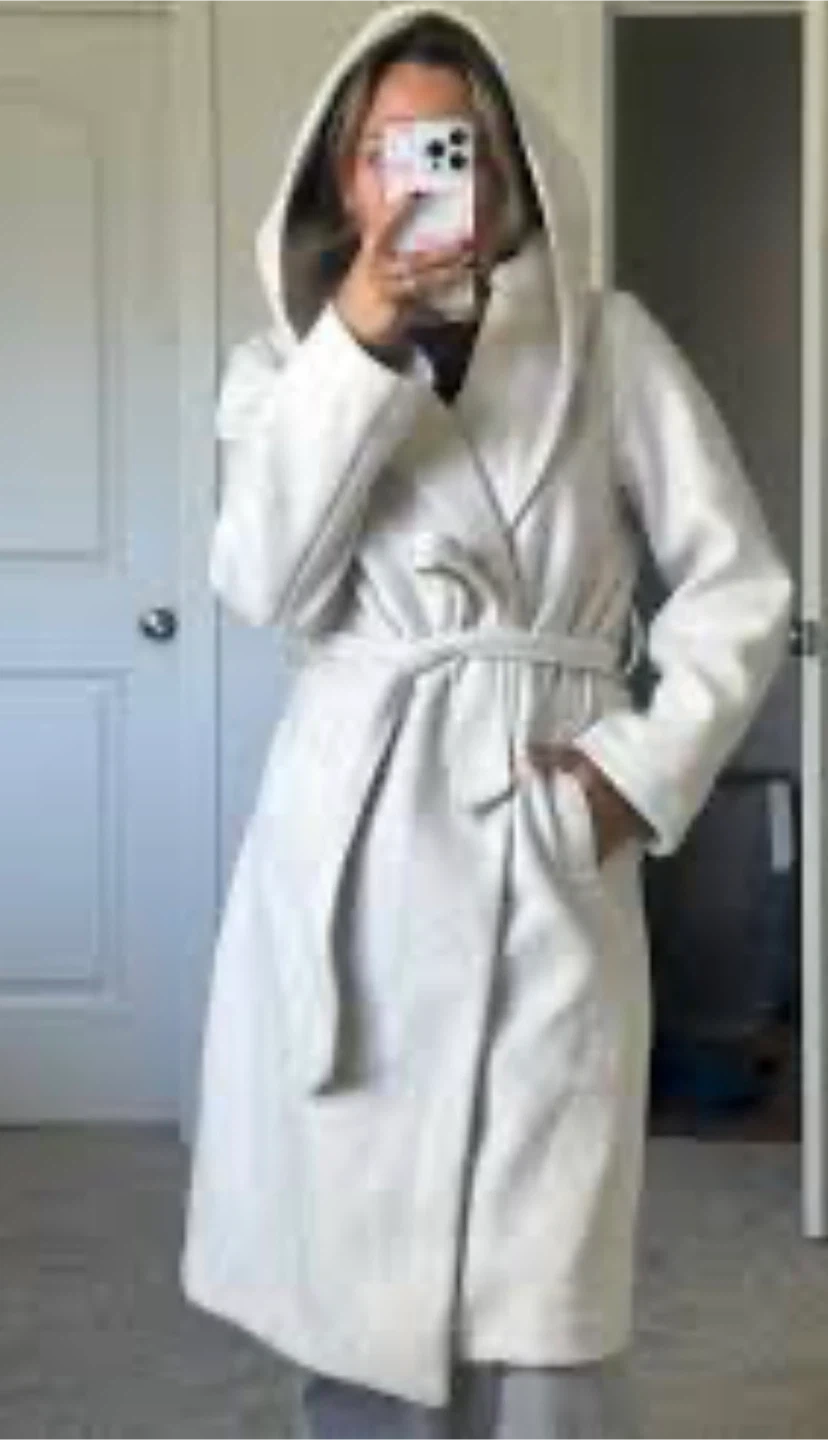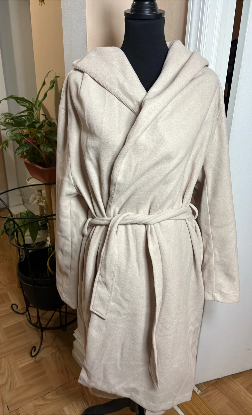 Selling a cozy beige hooded robe from Shein. It's a size XL and features a tie waist. Perfect for Protect yourself from the cold if you want to go for a walk.