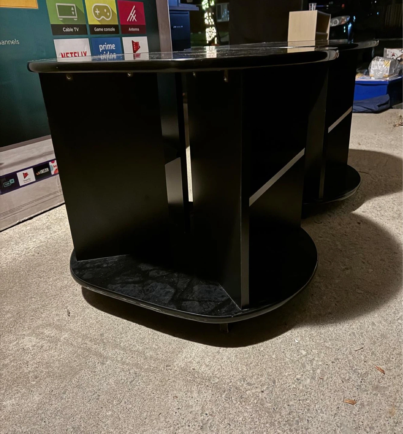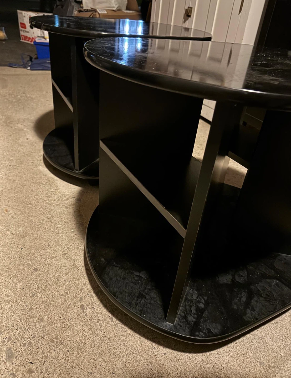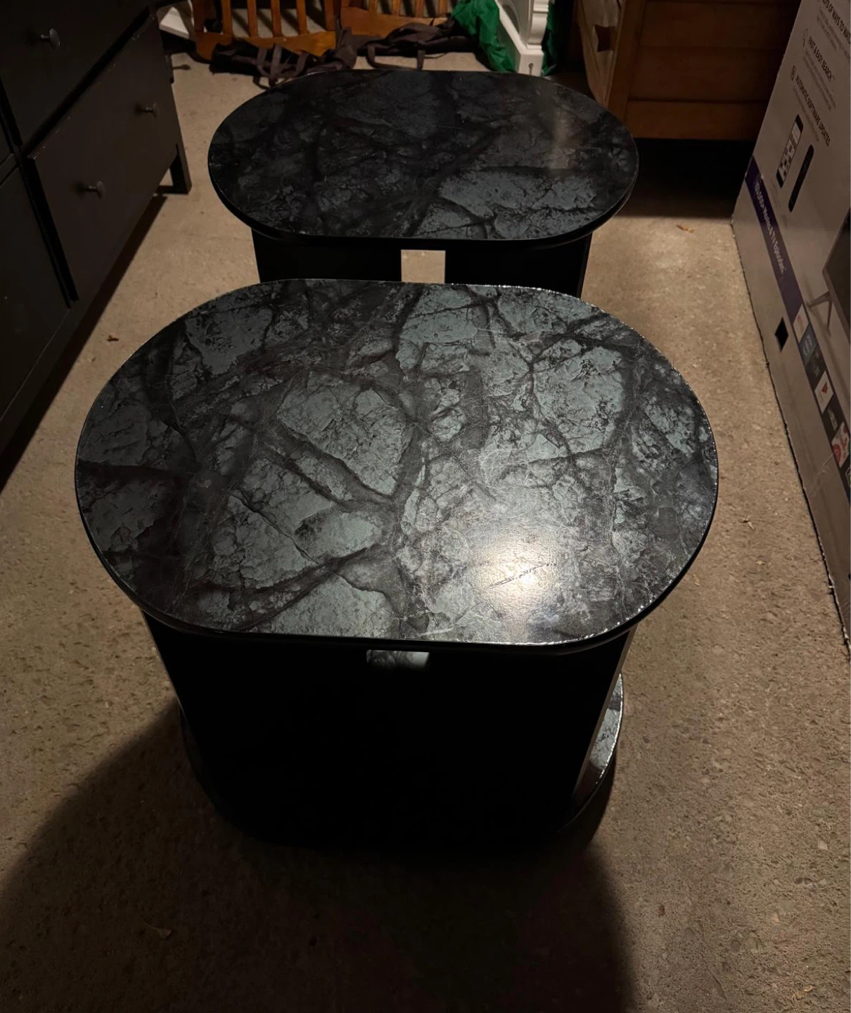Selling a set of two black end tables. They have a unique design with a marble-like top and are in good condition. They would be a great addition to any living room or bedroom