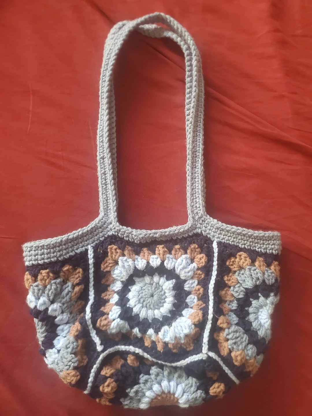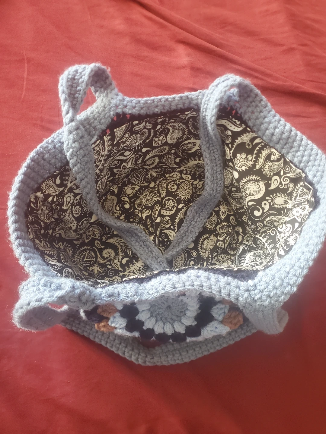 Selling a unique handmade crochet tote bag! It's got a lovely floral granny square design on the outside and a patterned fabric lining inside. Perfect for carrying your essentials in style!